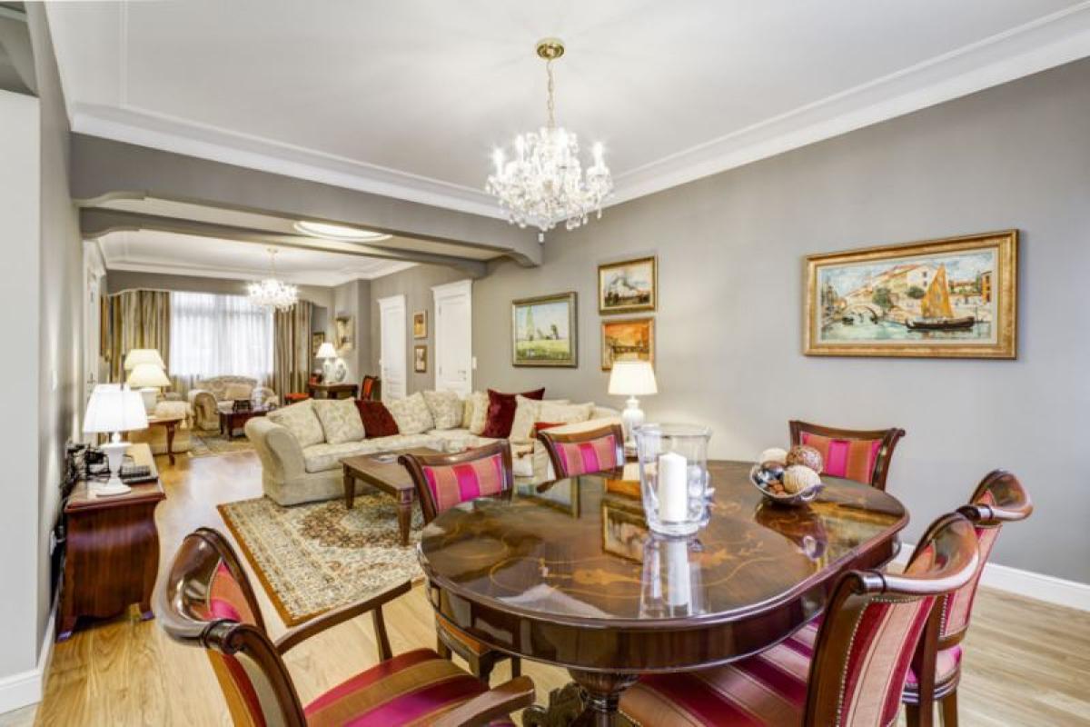 Galardo Real Estate rents an extremely spacious and luxurious apartment in the pedestrian area of Vitosha Blvd. Area of the property: 160 sq.m. It is located in a cultural monument building. The apartment has high aristocratic ceilings and after major renovation. It consists of a living room with a dining room, a fully equipped kitchen with an island and high energy class appliances, two bedrooms, two bathrooms with a toilet, an additional guest toilet and a utility room with a washer and dryer. The apartment is on a high third floor. Two elevators in the building.
