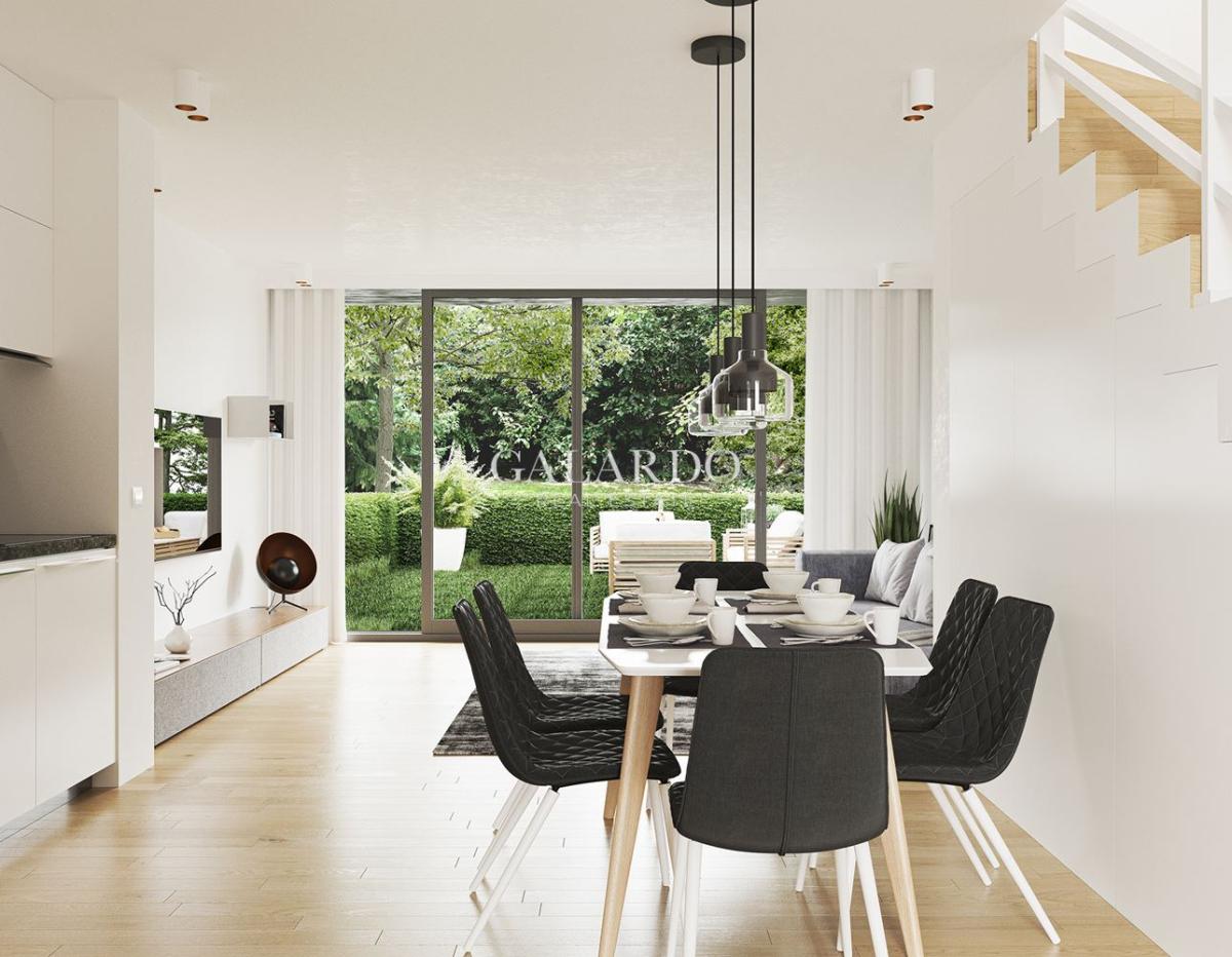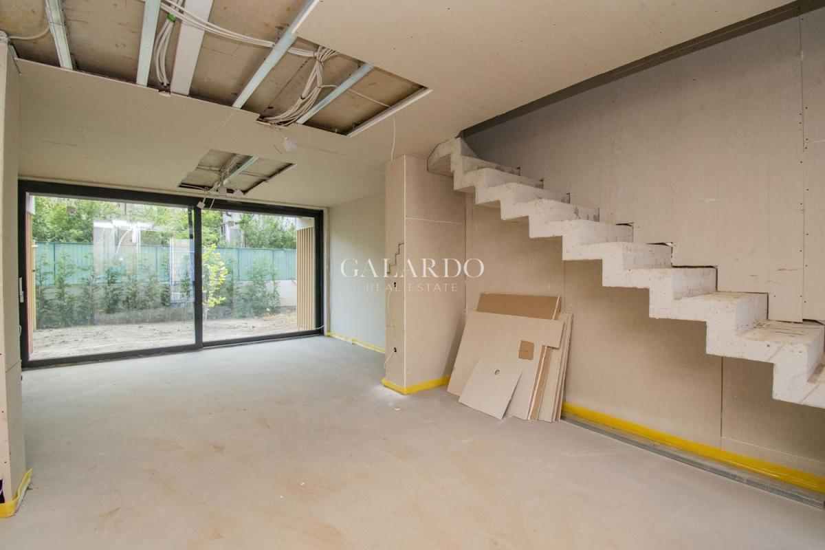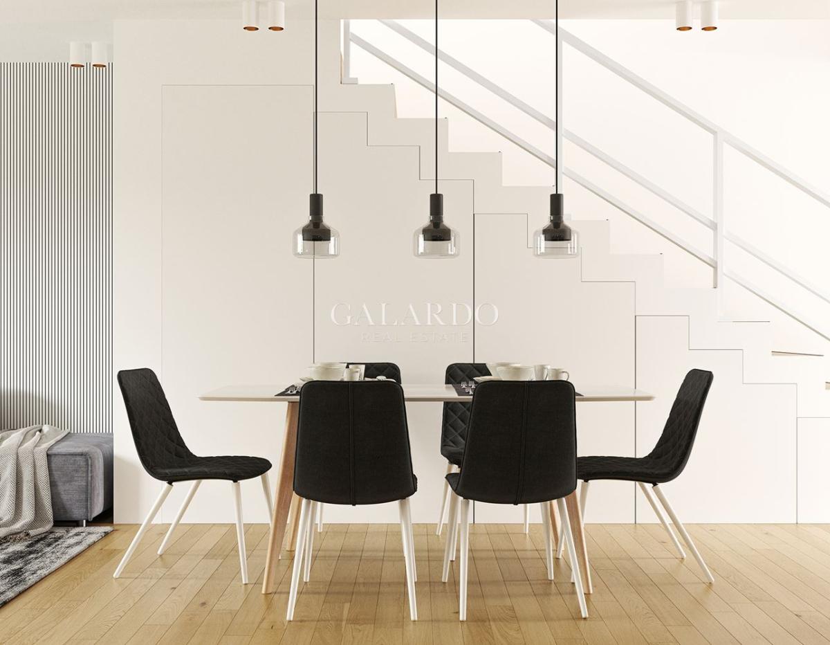 The apartment is located on three levels - ground floor and two above ground floor. It includes a terrace and a lovely loggia facing the landscaped interior of the complex.