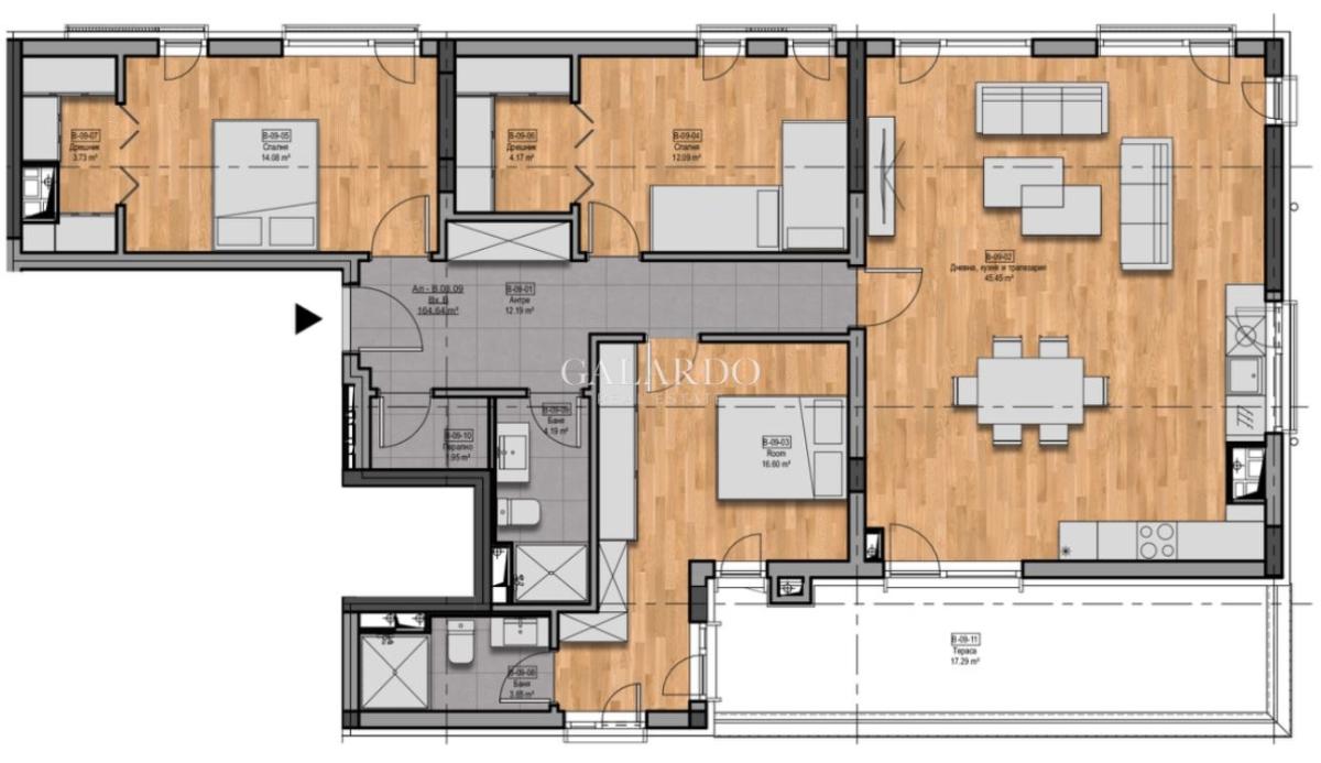 Galardo Real Estate presents an exceptional four-bedroom apartment located in one of the most preferred southern areas of Sofia - Krastova Vada district. The property is a new construction from 2022, combining a modern vision, functional layout and comfort of modern urban living. The apartment has a total area of 164.64 sq m and offers excellent opportunities for both a family home and an investment. The apartment is transitional, and impresses with its comfortable interior layout, bright rooms and a sense of space.