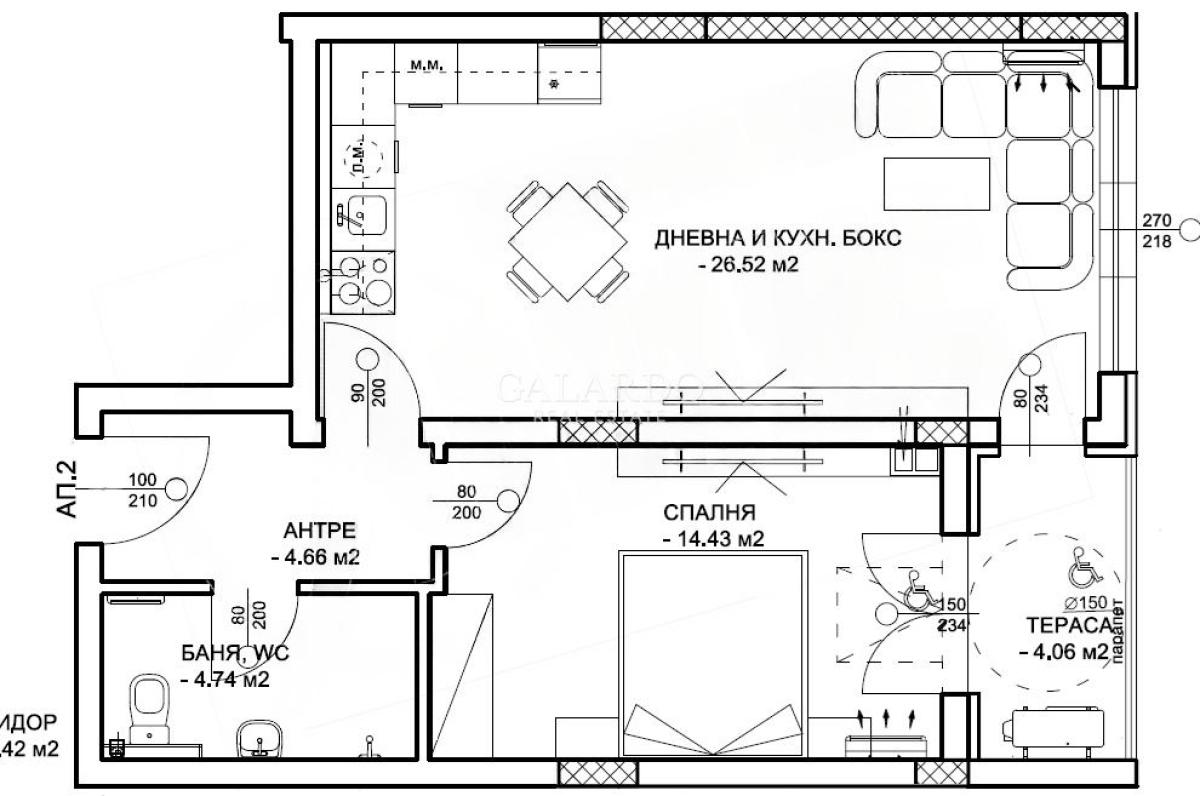 This apartment offers you a very large living room with a kitchen, a bathroom, balcony. The apartment is situated on the first floor on a very quiet cozy street, only a few meters from one of the biggest park in Plovdiv, Youth Hill.