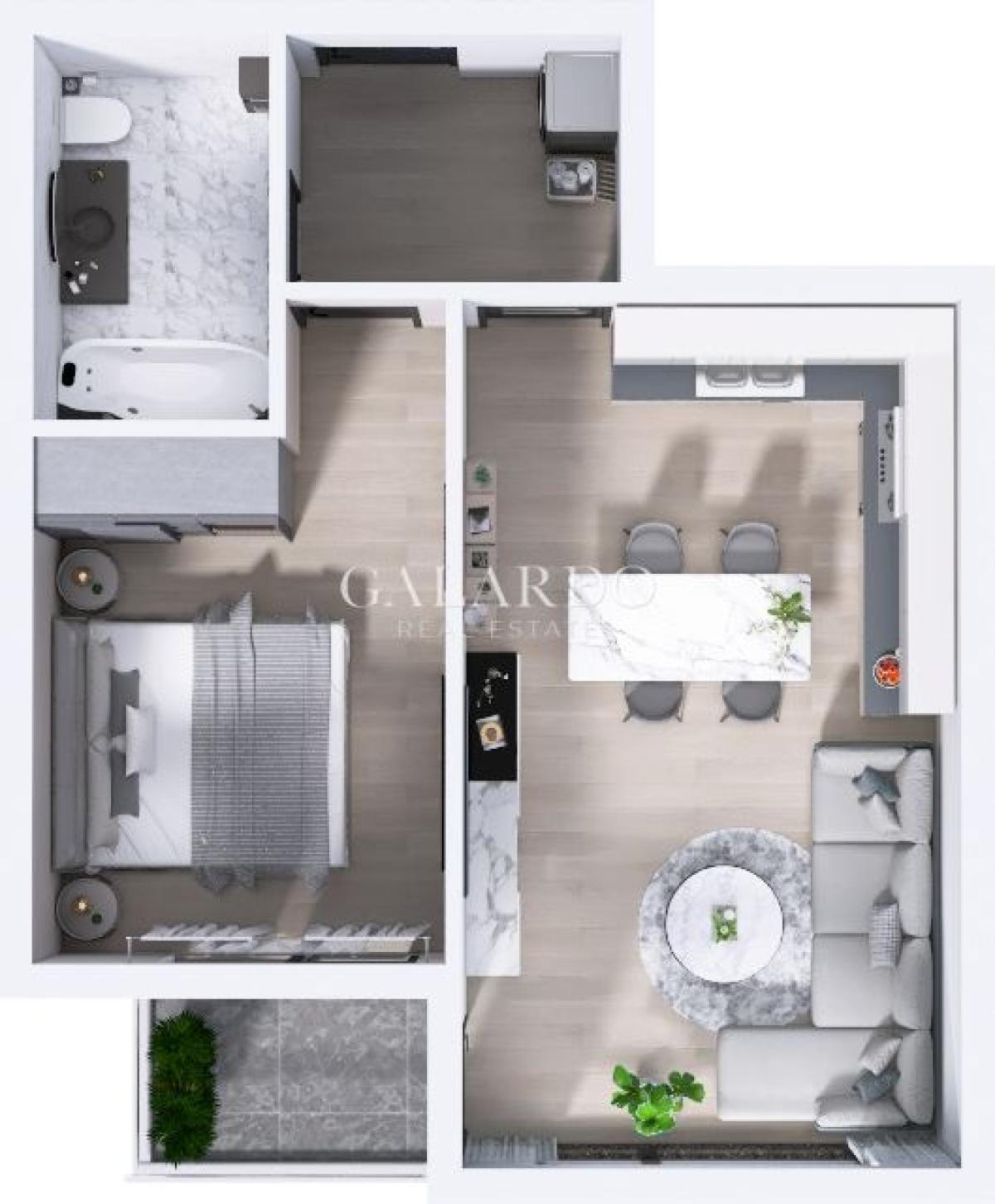 The apartment is located in a new modern building with five floors, in a naturally landscaped residential complex with it’s own park and playground. It consists of a living room with a kitchen, a bedroom, a bathroom and a terrace.