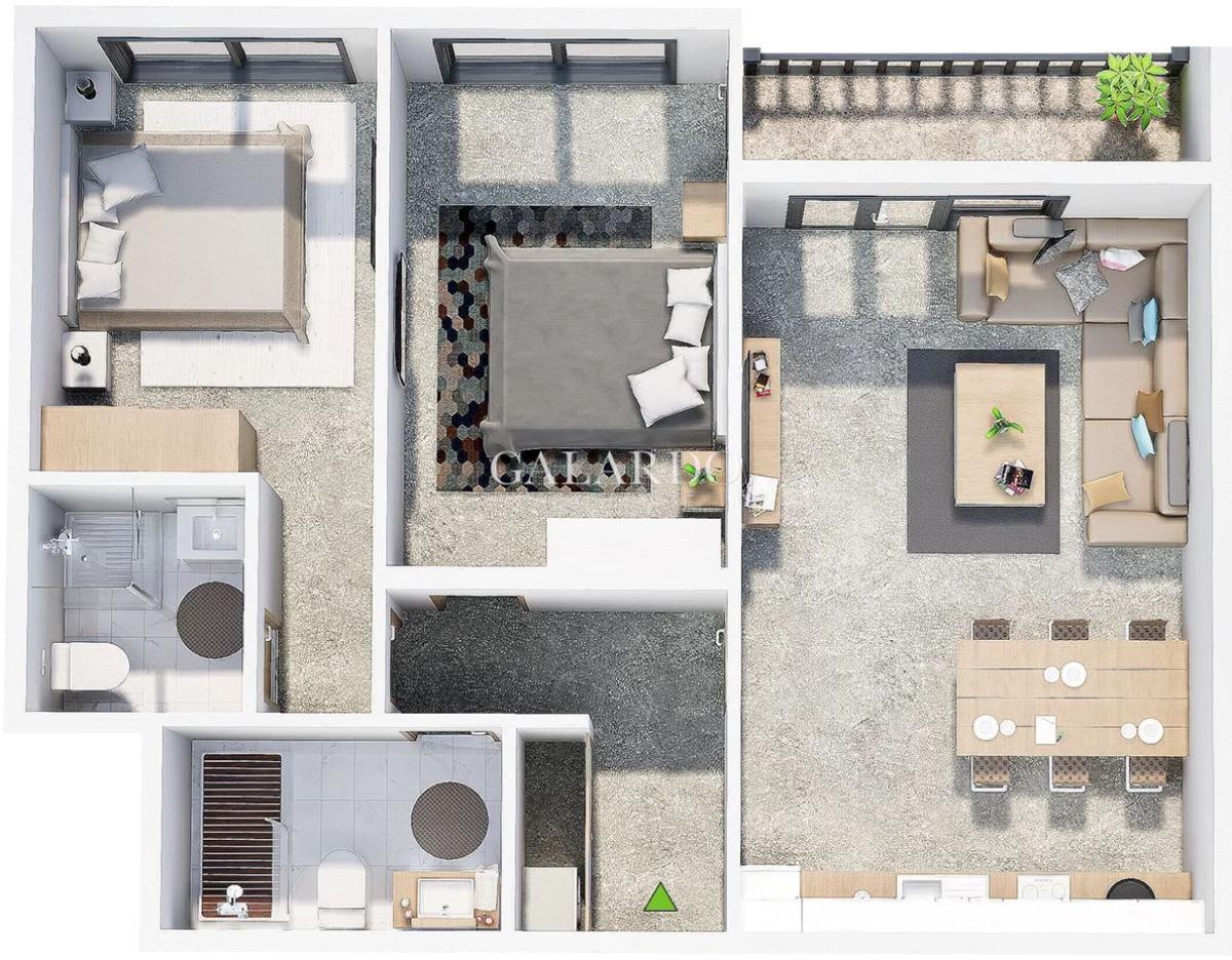 The apartment is located in a new building with a modern architecture, in a residential complex with natural landscaping and a recreation area. It consists of a living room with a kitchen, two bedrooms, two bathrooms, storage and a loggia terrace.