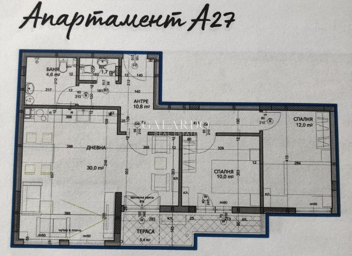Galardo real estate offers a two bedroom apartment for sale in Hristo Smirnenski district. The apartment is south facing, located in new building on fifth from six floor. It consists of a living room with a kitchen, two bedrooms, two bathrooms and a terrace.