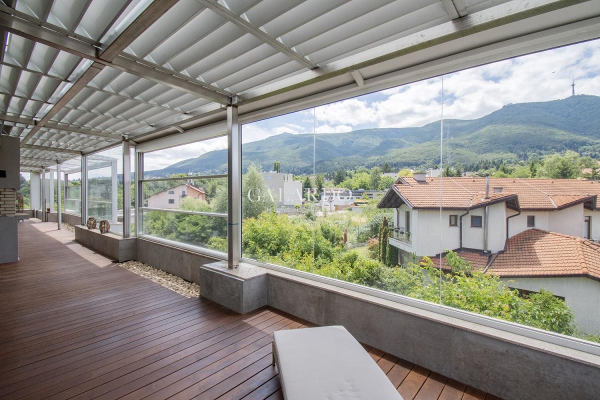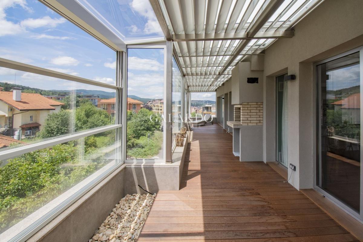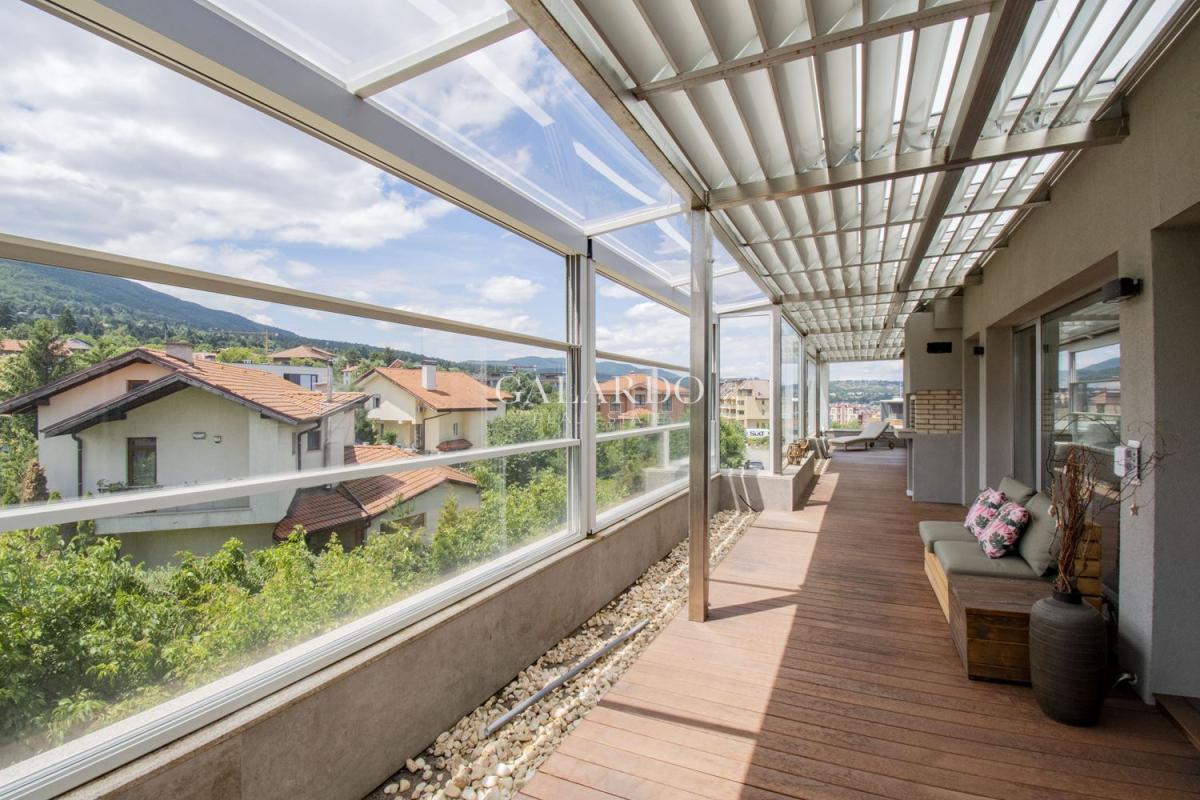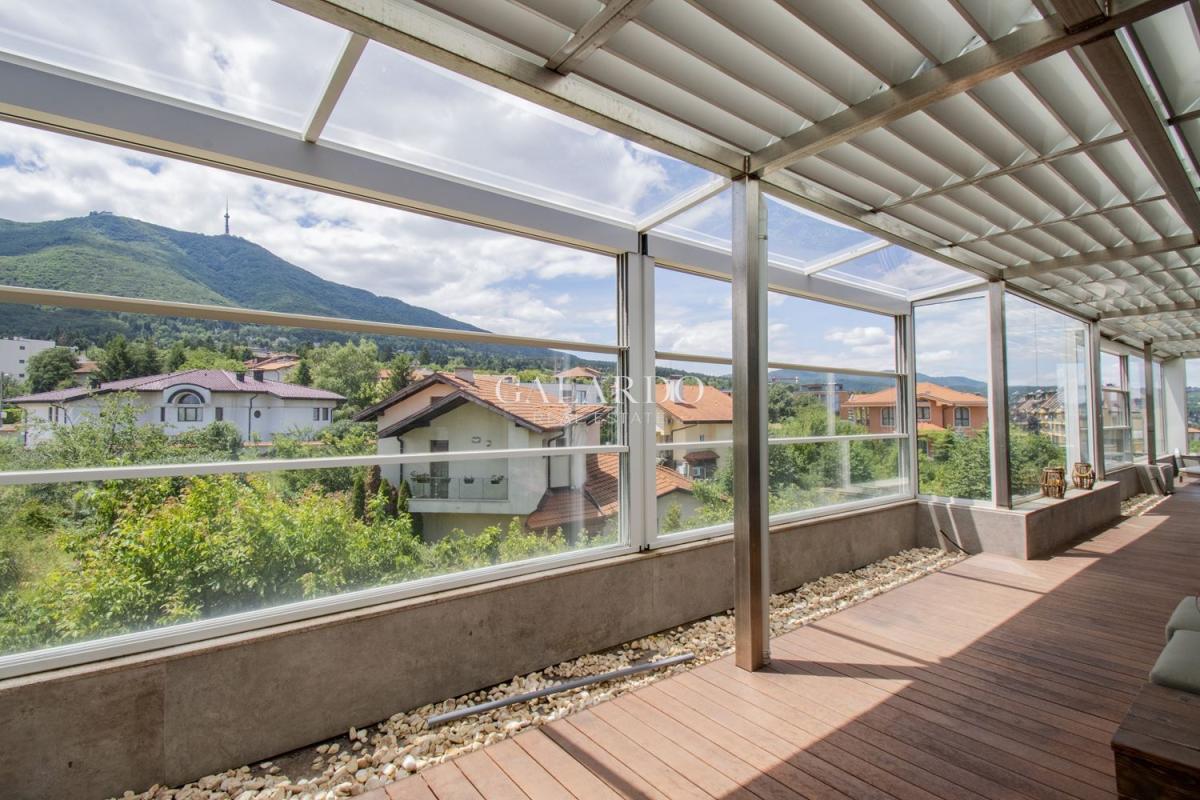 Южната тераса, с изглед към Витоша, е с големина 60 кв. м., изцяло покрита и с настилка от гладък термоясен, което позволява лесна поддръжка.