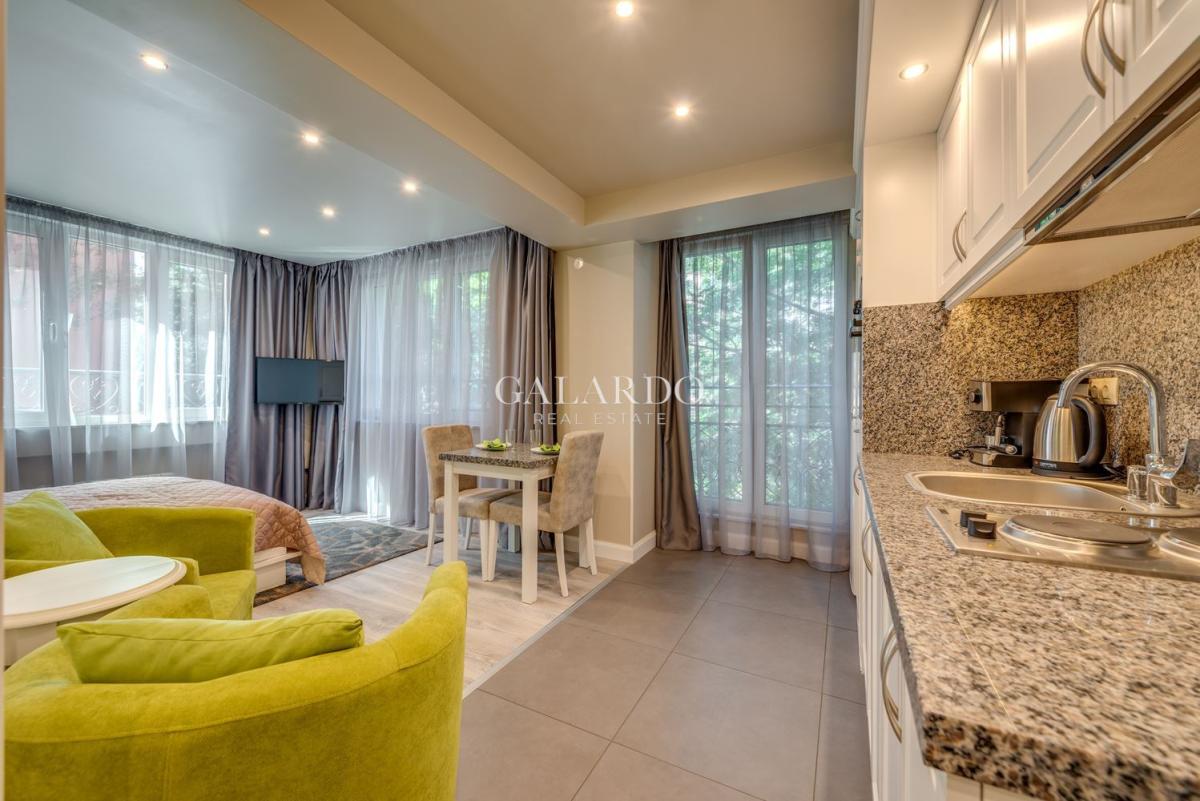 Galardo Real Estate има удоволствието да представи на Вашето внимание прекрасен еднопространствен апартамент на тиха улица близо до бул. "Дондуков". Сградата се намира в непосредствена близост до района на Докторски паметник и центъра на София. Апартаментът е изцяло обзаведен и напълно оборудван с висок клас мебели и електроуреди, както и смарт телевизор, индивидуални рутери във всеки апартамент. Има възможност за записване на часове за масаж. Цената включва всички режийни разходи на апартамента - ток, отопление, вода, интернет, СОТ, техническа поддръжка. Има възможност за наемане на паркомясто срещу допълнително заплащане по договаряне. В цената е включено ДДС 9%.