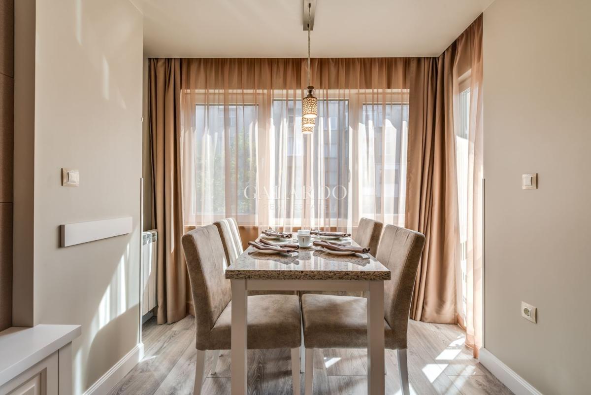 Апартаментът е изцяло обзаведен и напълно оборудван с висок клас мебели и електроуреди, както и смарт телевизор, индивидуални рутери във всеки апартамент. Отоплението е с ТЕЦ, разполага с климатици и бойлер..