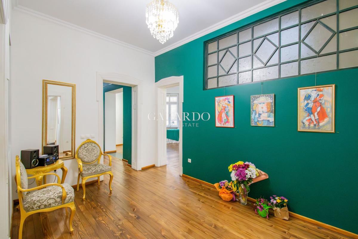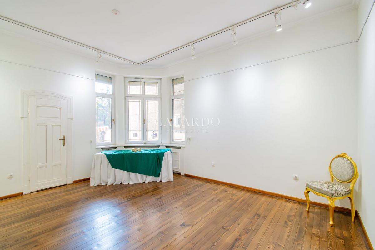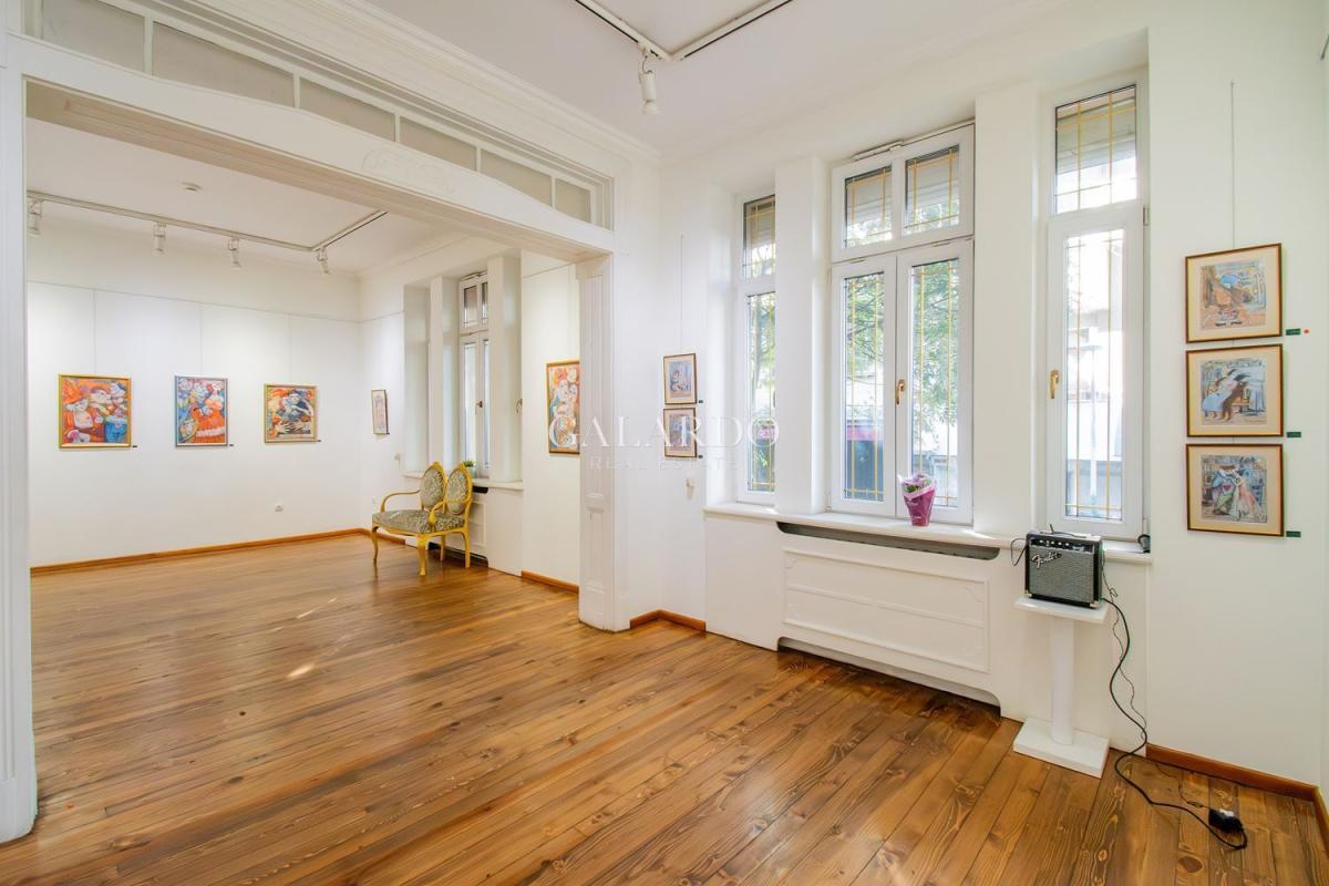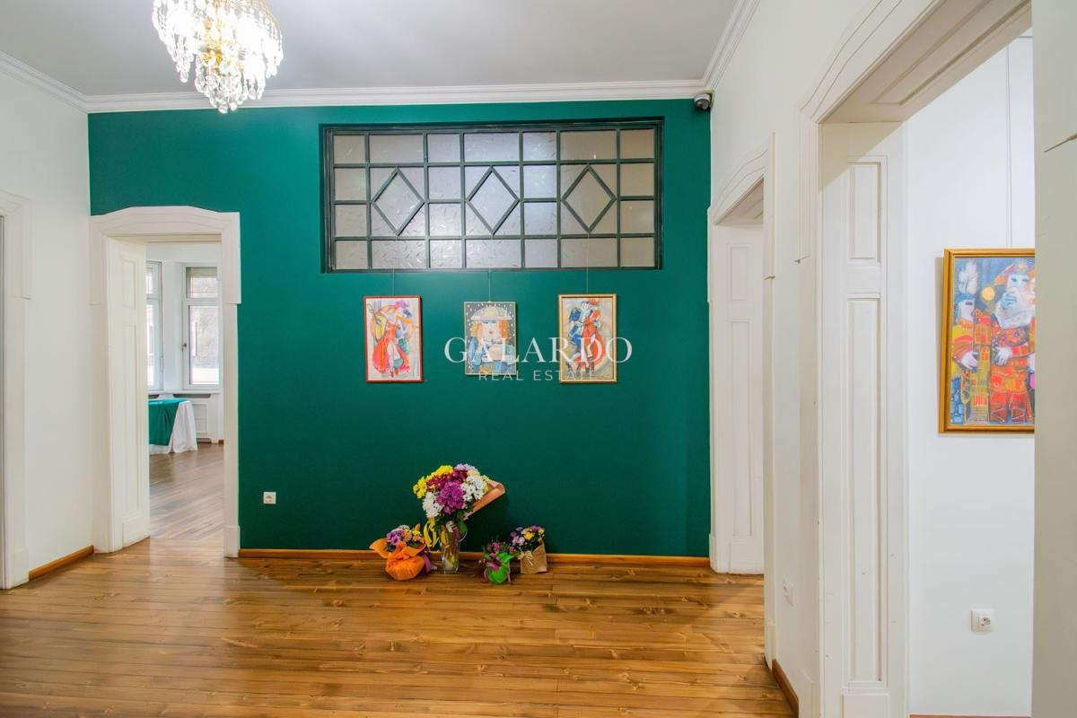 Пространството впечатлява с високи тавани, оригинални орнаменти и автентичен дървен под, създаващи усещане за стил и представителност.