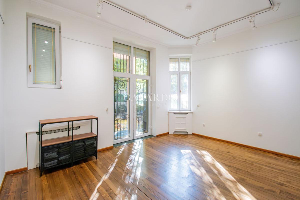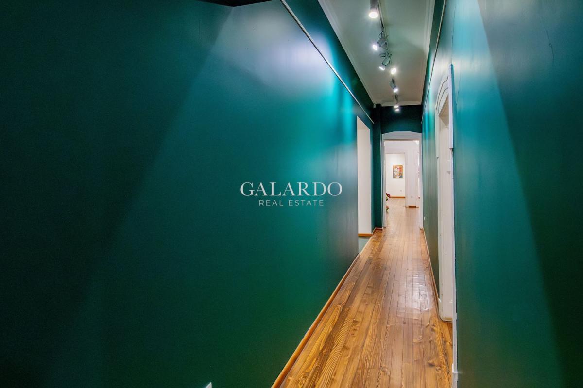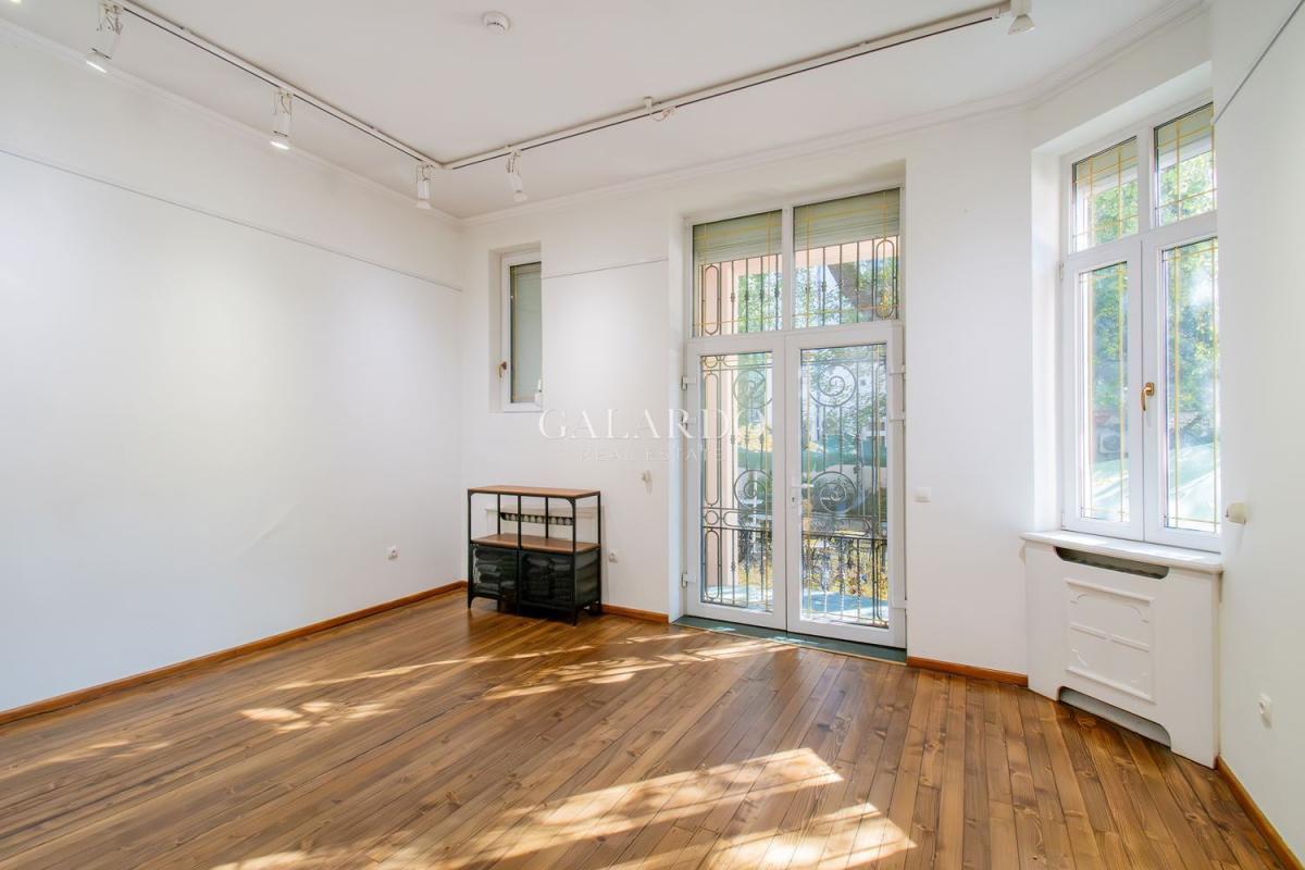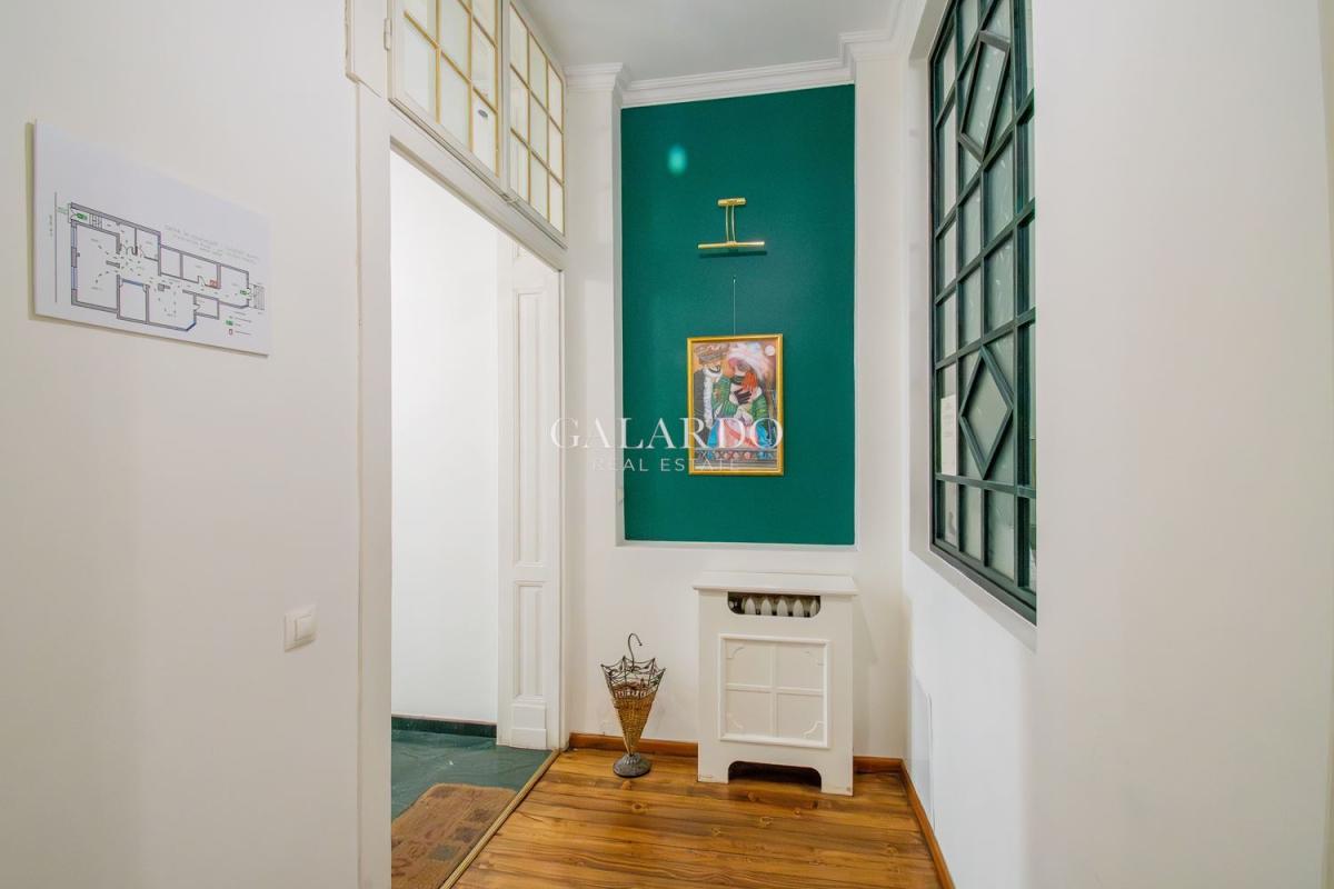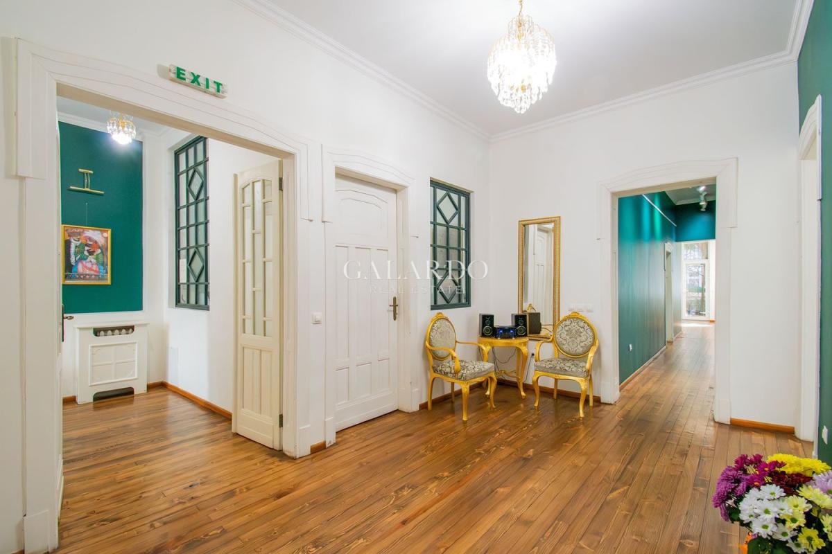 Пространството впечатлява с високи тавани, оригинални орнаменти и автентичен дървен под, създаващи усещане за стил и представителност.