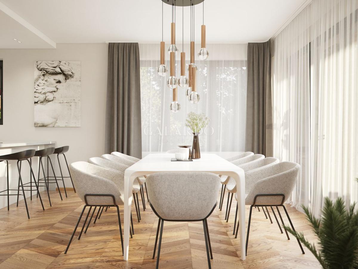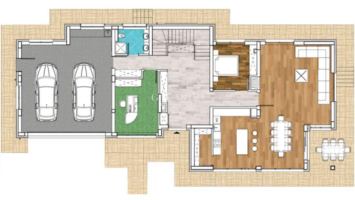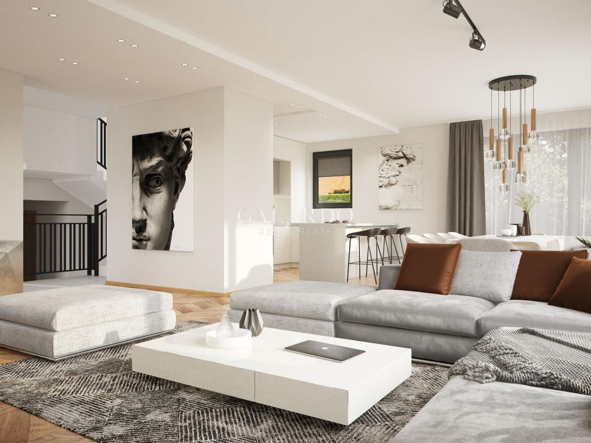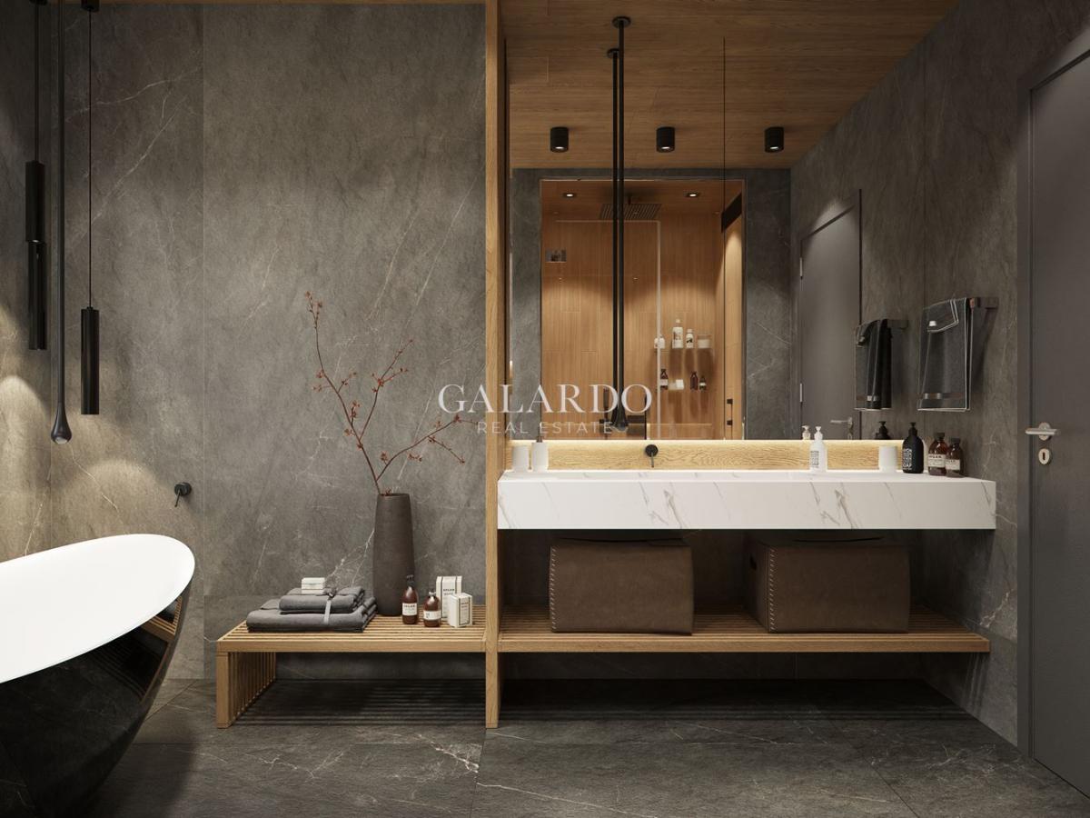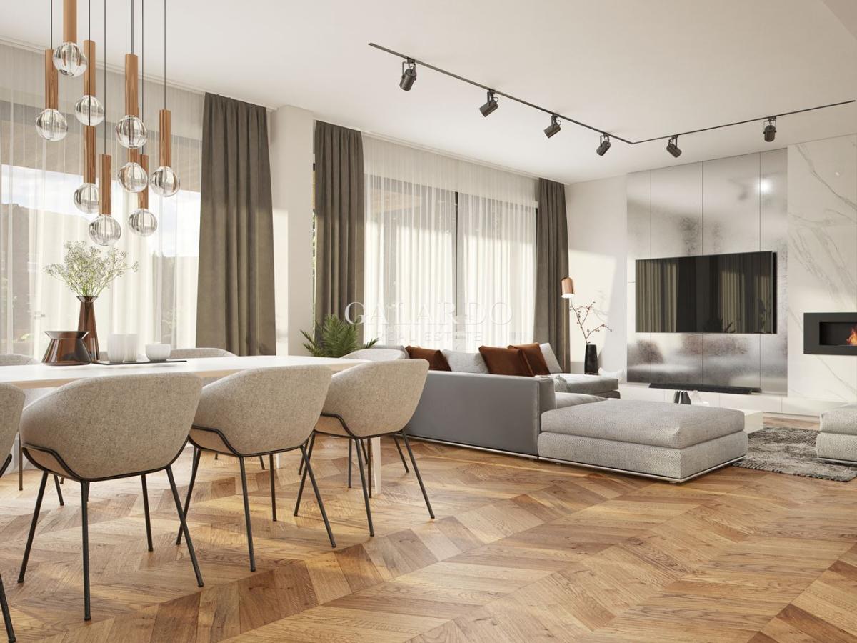 Двора е 980м2, озеленен с различни храсти, дървесна растителност и подходящи сортове трева. На разположение на бъдещите собственици са и поливни системи, които се управляват и програмират през Smart системи от телефон или таблет, за да бъде улеснена поддръжката на дворните пространства.