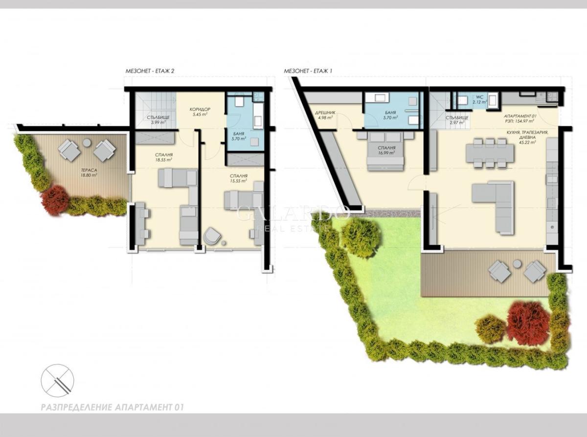 Galardo Real Estate с удоволствие представя апартамент с три спални и собствена градина в кокетна нова сграда в Бояна. Апартаментът е функционално разпределен на две нива и има Застроена площ от 148.87кв.м.