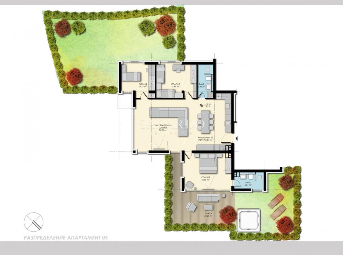 Galardo Real Estate с удоволствие представя апартамент с три спални и собствена градина в кокетна нова сграда в Бояна. Апартаментът е функционално разпределен и има Застроена площ от 170.04кв.м.