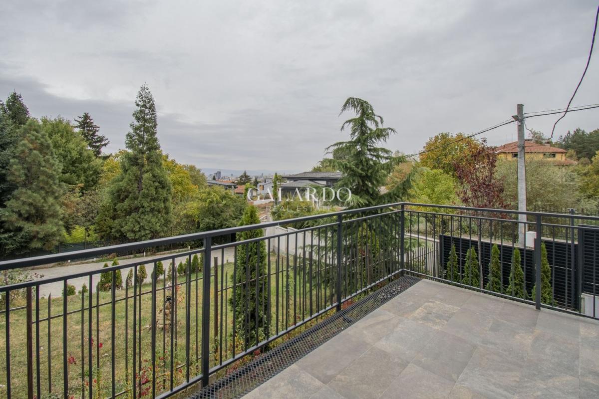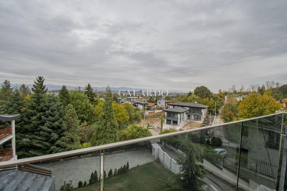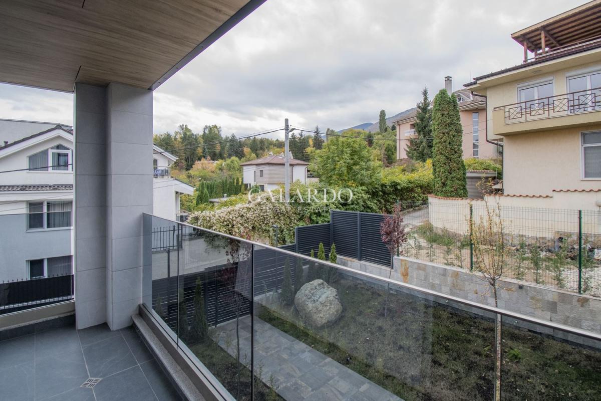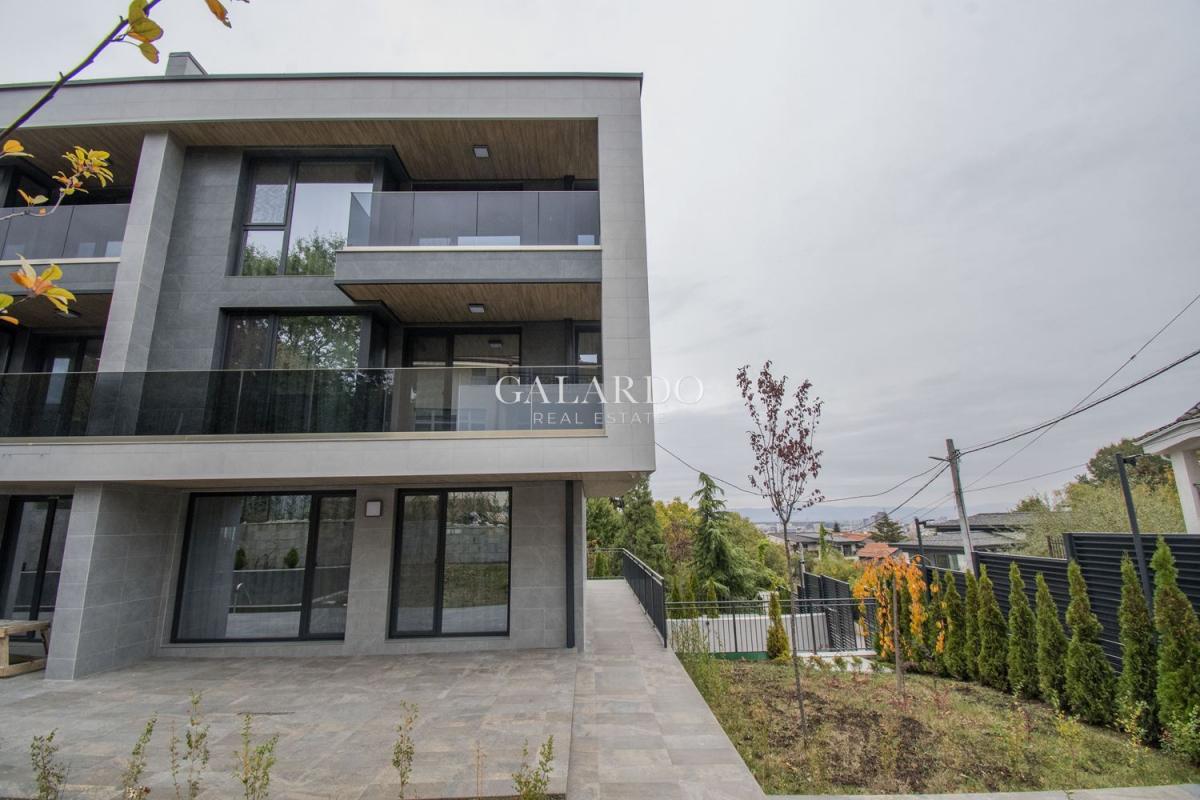 Galardo Real Estate представя чисто нова, напълно обзаведена редова къща, част от малък комплекс в Бояна, състоящ се от общо три къщи, като за общо ползване се предоставя басейн и барбекю. Къщата е крайна, изпълнена изцяло по дизайнерски проект до най-малкия детайл. Използваните материали и обзавеждане са висок клас, техниката е на марките NEFF и AEG.Отоплението и охлаждането се извършват чрез термопомпа Mitsubishi. От имота се открива панорамна гледка към Витоша и града, а локацията осигурява бърз достъп до Околовръстен път и бул.България!