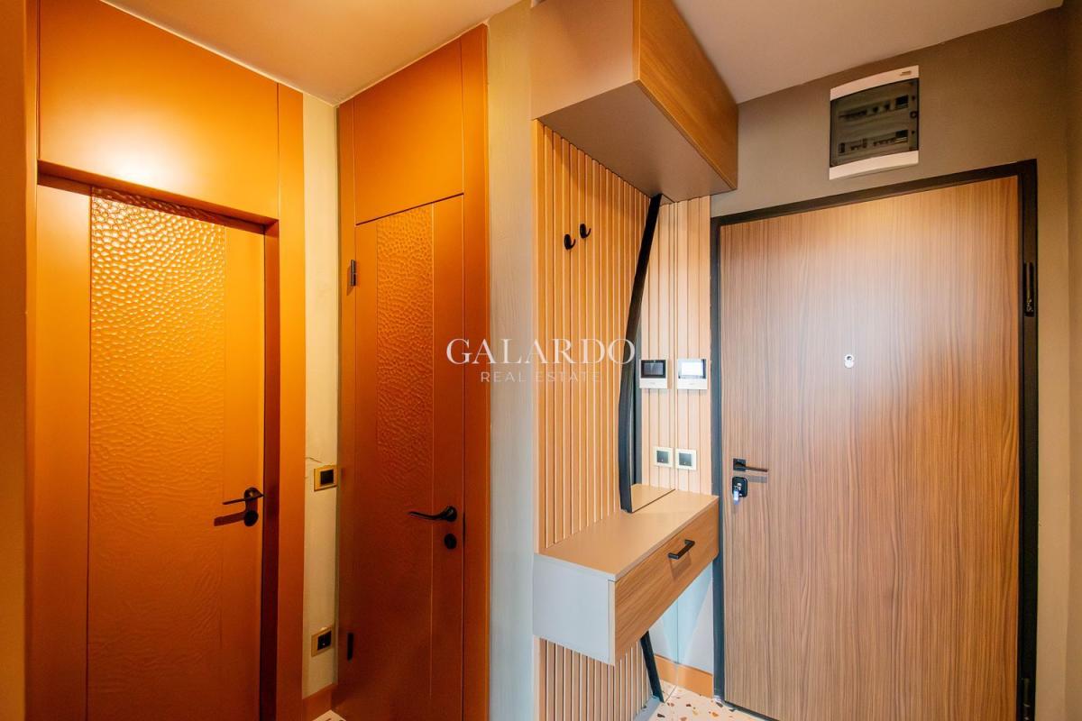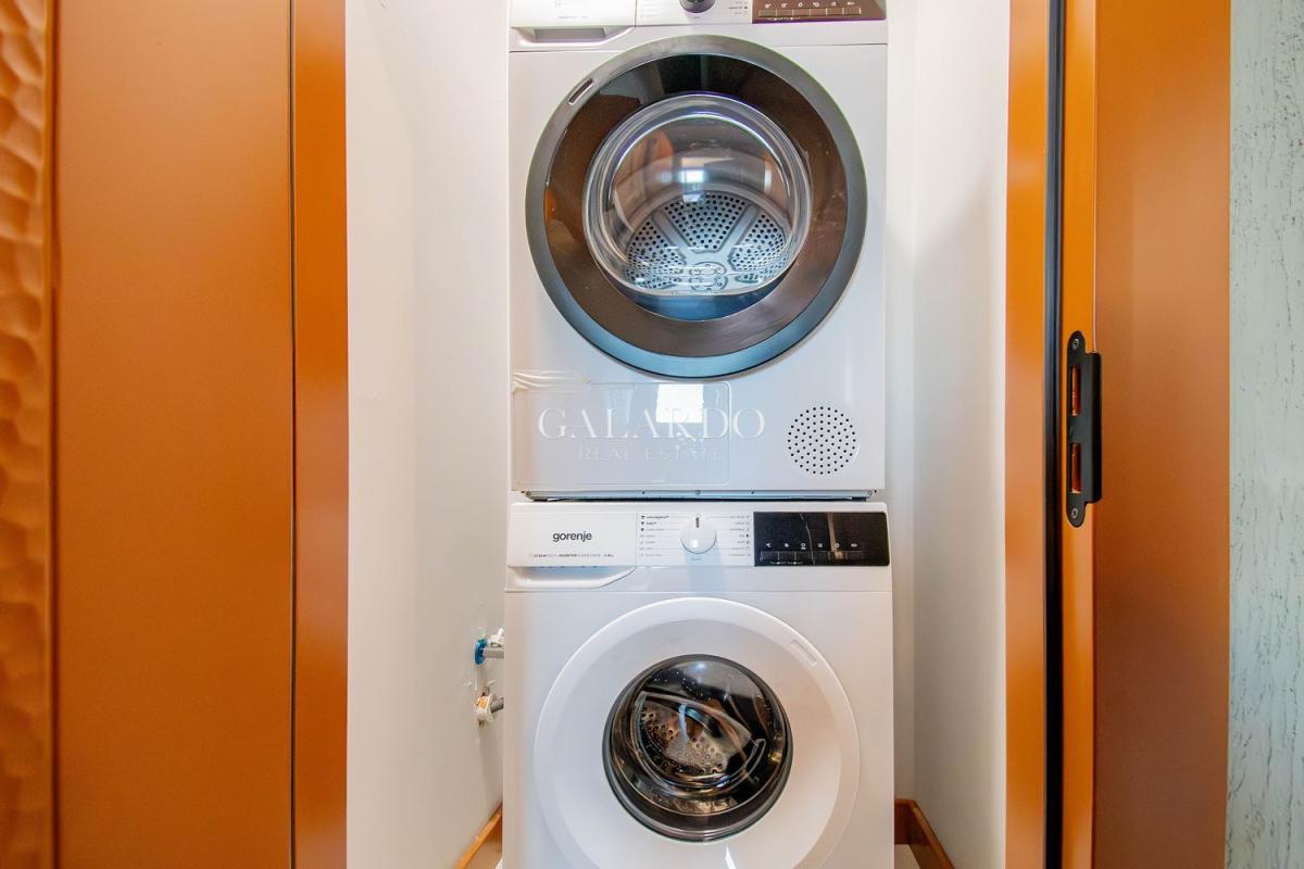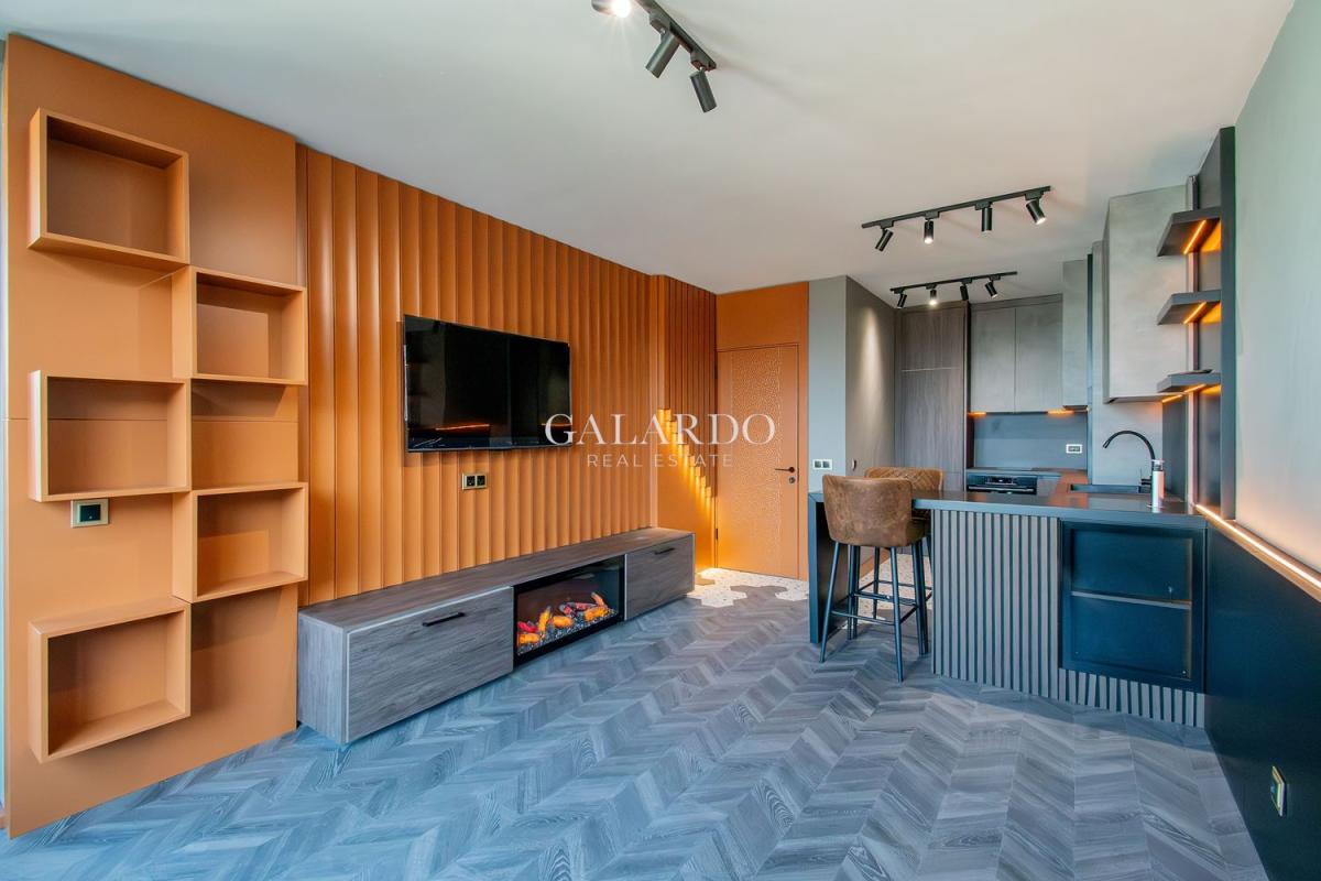 Апартаментът е с чиста площ от 63 кв.м и се предлага напълно обзаведен с внимание към всеки детайл. Интериорът е реализиран с мебели по поръчка, декоративни мазилки и дизайнерско осветление, създаващи усещане за комфорт и стил. Кухнята е оборудвана с висок клас вградени електроуреди Gorenje.