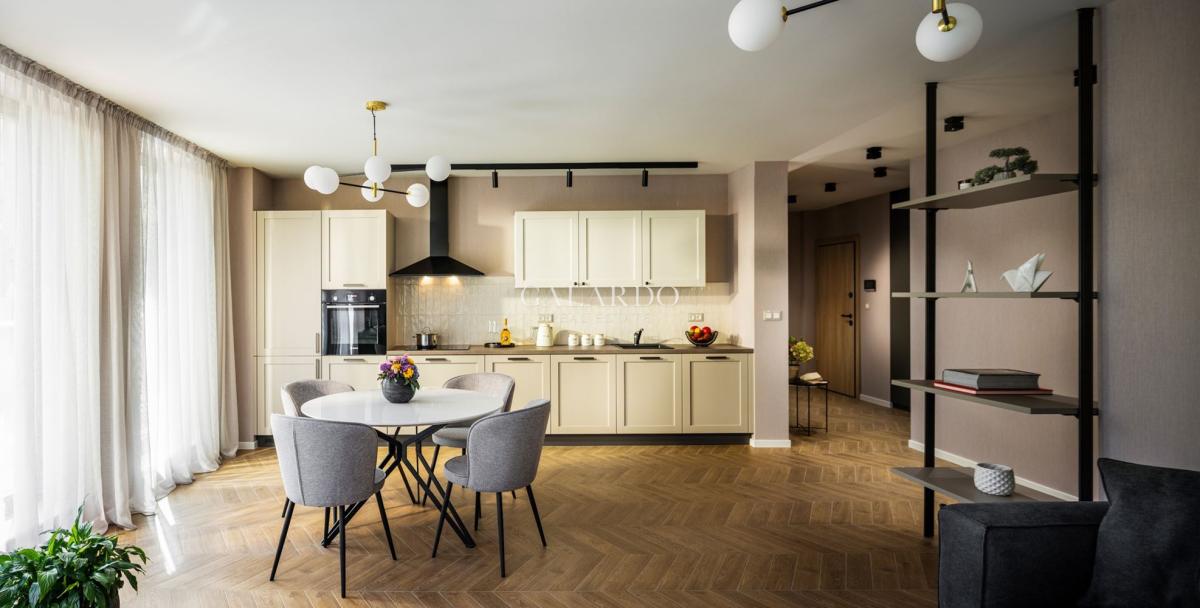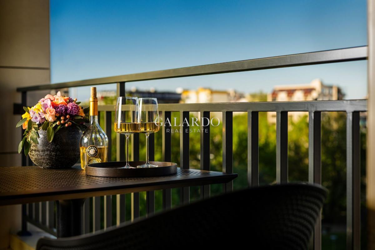 Просторен, светъл и с много обширни пространства както във всекидневната, така и в двете спални, с площ от 128,11 кв. м, апартаментът е напълно обзаведен, отличава се с висококачествени материали, висок клас уреди и мебели с изтънчен вкус.