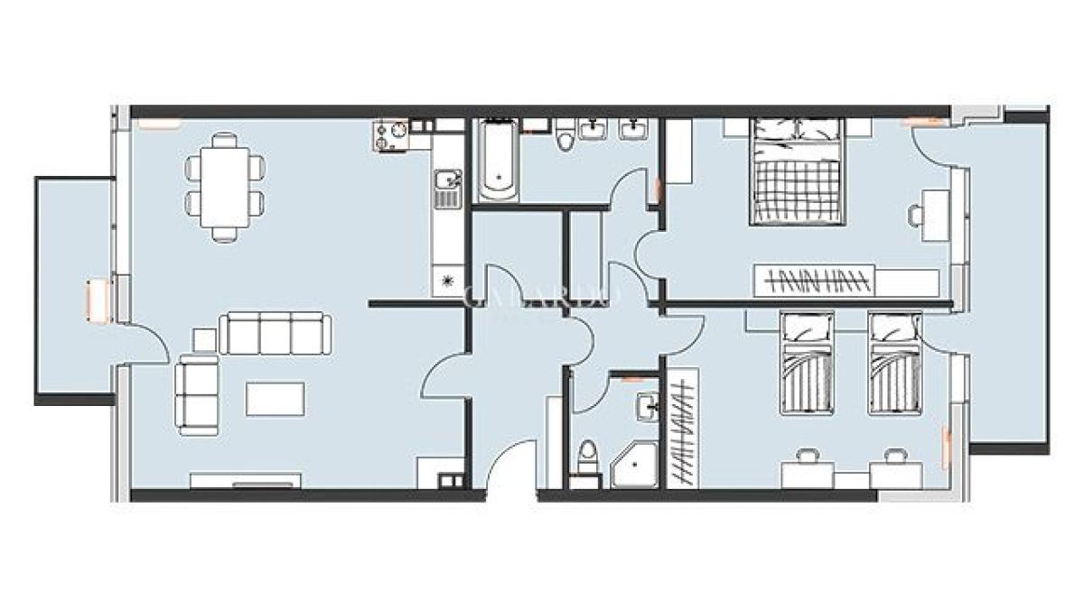 Galardo Real Estate продава слънчев и светъл тристаен апартамент в сграда пред акт 15. Имотът е в комплекс от затворен тип със собствен двор. Предвидена е зона за спорт и детска площадка. Площ - 150,32 кв.м. Изложение: юг. Очаквано Разрешение за ползване: април 2024 година. Възможност за закупуване на подземни паркоместа или гаражи. Налични складови помещения на цена 3 600 €.