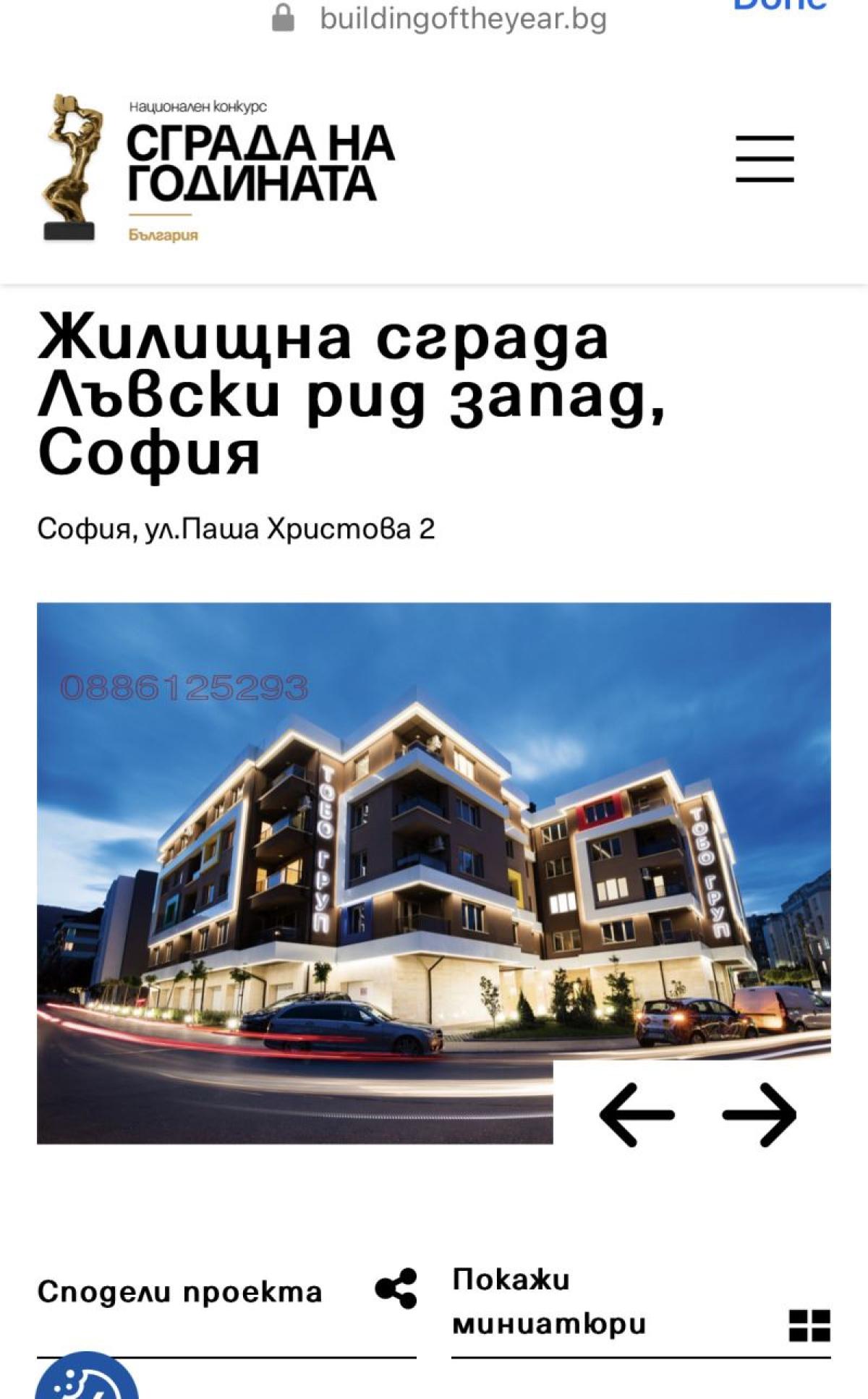 Цената е обща за апартамента и гаража! От собственик и без комисионна! Тристаен с гараж, южен, светъл и с гледка към Витоша, апартамент в кв. Манастирски ливади-запад на ул. Паша Христова, в сграда номинирана за 'Сграда на годината'. ЗП площ 78.30 кв.м, в която не са включени общите части. На 300 метра от спирката на трамваи 7 и 27, с бърз и лесен достъп до центъра. Имотът е нов и в него не е живяно никога. Подови настилки ламинат и плочки, санитарните помещения са завършени, стените са боядисани с латекс, нови врати. Апартаментът е готов за обзавеждане според желанията на новите си собственици. Разпределение: Просторно входно антре, хол с кухненски бокс и тераса, две спални, баня с тоалетна, отделно още една тоалетна. Подробен план с разпределение и квадратура може да се види в приложените снимки. Контролиран достъп до сградата, луксозно изпълнени общи части с отделна врата между асансьора и коридора с входната врата на апартамента. Цялата сграда е населена и в нея няма други свободни апартаменти. Огромно предимство е гаражът, който се намира на кота 0, на нивото на улицата и в близост до входната врата на сградата. Пред гаража има възможност за паркиране на втори автомобил. Инфраструктурата в района е добре развита, свободните пространства са озеленени, улиците са в отлично състояние, а в непосредствена близост има детски площадки, магазини, заведения и лекарски кабинети. За контакт и огледи: 0886125293;0887318134 , тел.: 0886125293
