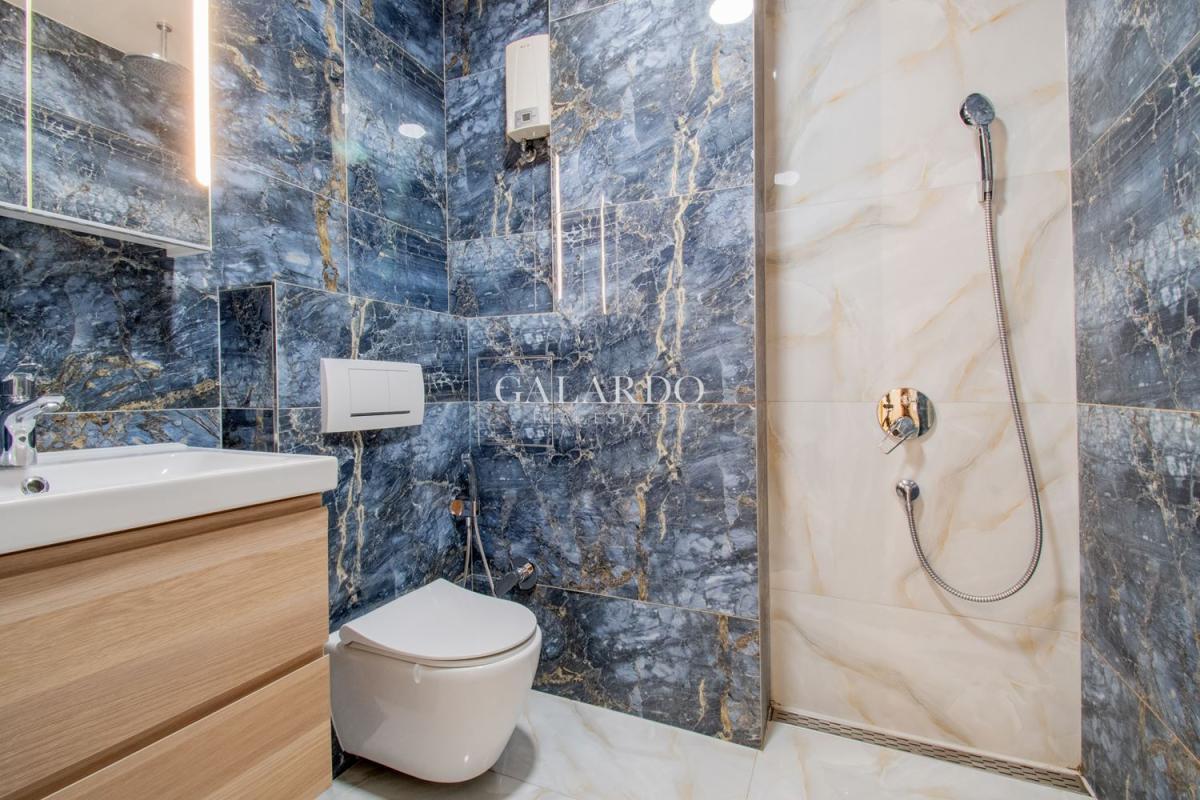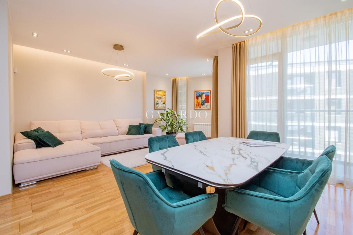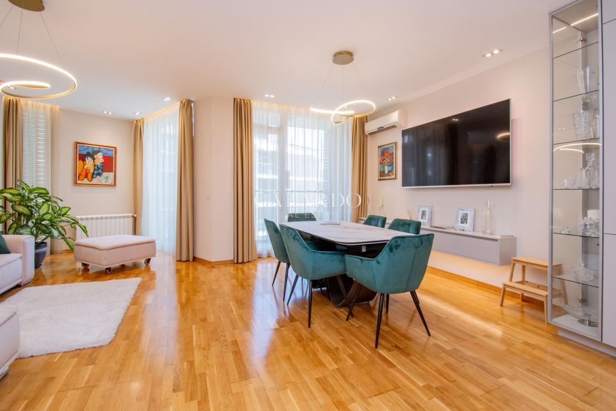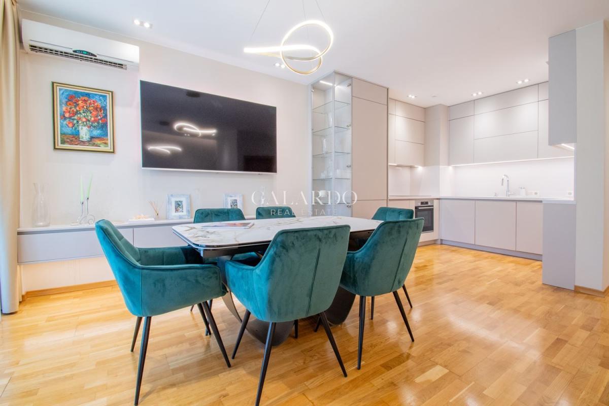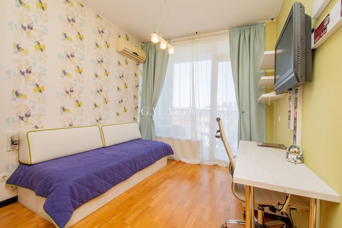 Сградата разполага с луксозни общи части, от гранит, видеонаблюдение и жива охрана. Визията на сградата се откроява с красива фасада с окачени елементи. Жилището заема четвърти етаж от седеметажната сграда и е 164 кв.м с идеалните части. Изложението е изток/югозапад, с гледки към града и Витоша. Имотът е изключително тих, на втора линия от бул.България и се предлага напълно обзаведено по дизайнерски проект, като се откроява с висококачествено изпълнение на довършителните работи.
