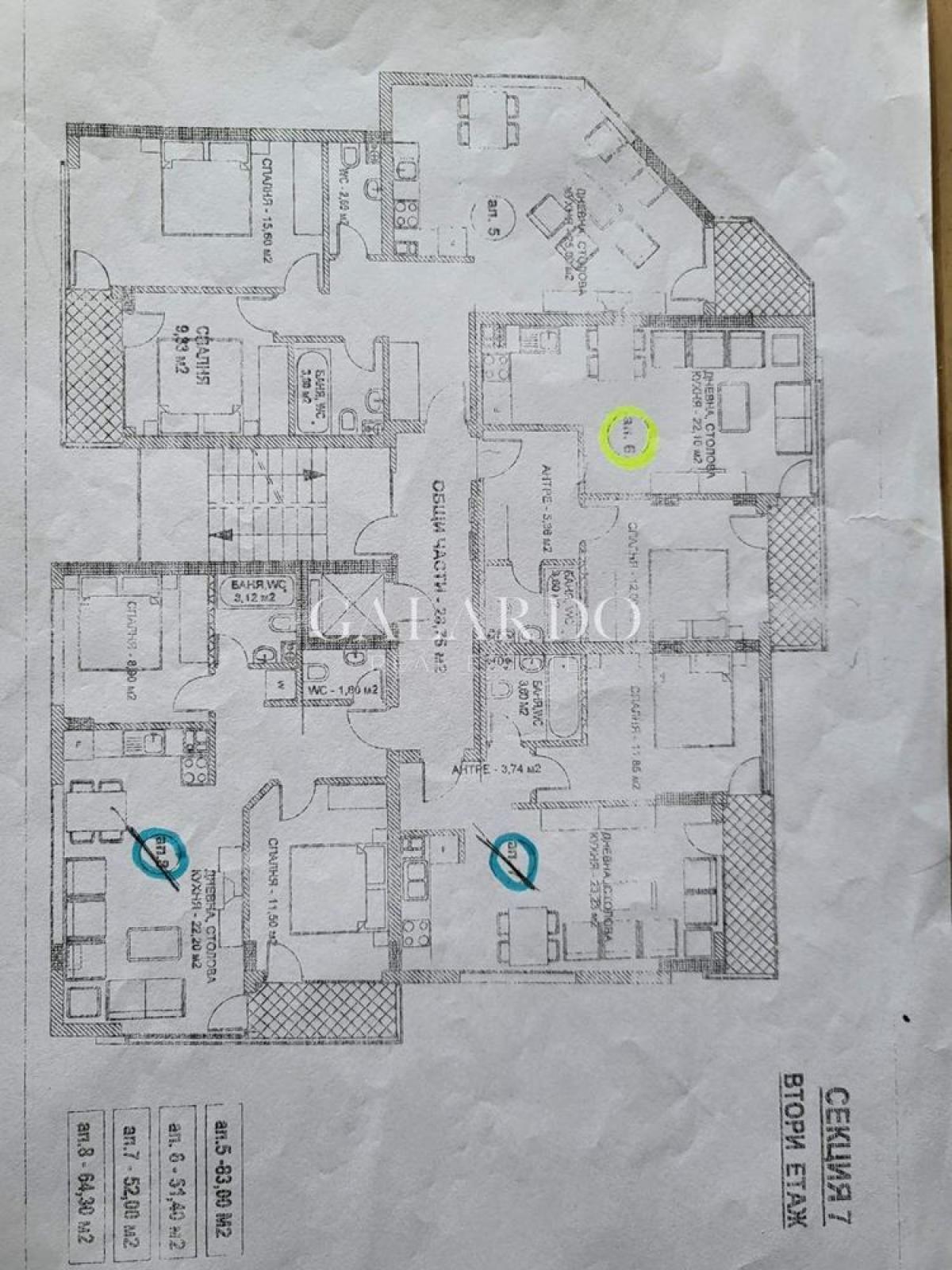 Застроената площ на имота е 64.30м2. Етажа е 1-ви над офиси.