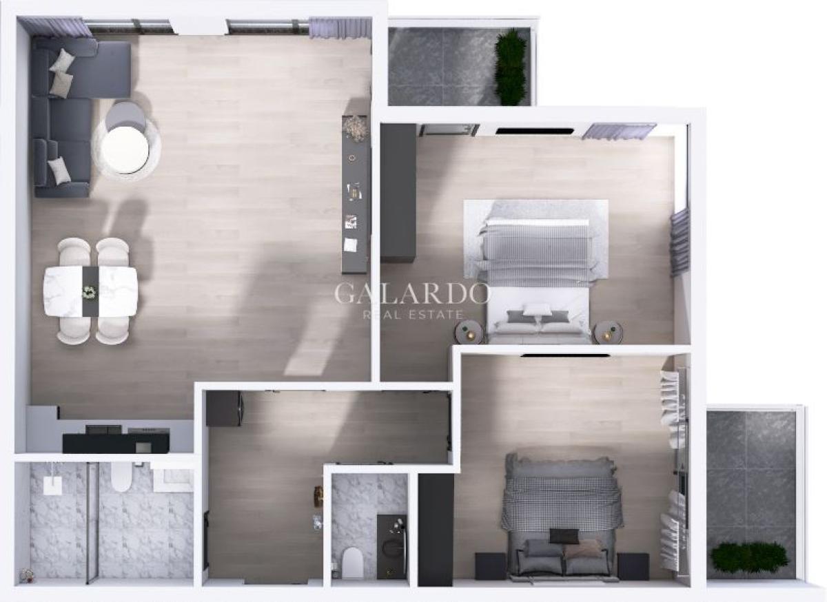 Жилището е разположено в пет етажна сграда с модерен дизайн, в естествено озеленен комплекс със собствен парк и детска площадка. Състои се от дневна с кухненски бокс, две спални, две санитарни възела и две тераса.