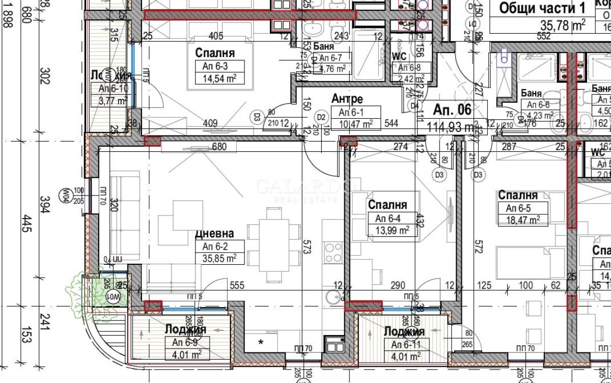 Апартаментът разполага с три спални и две бани, функционално разпределение и височина на таваните 2,90 м. Отоплението ще е на газ. Изложение изток/юг