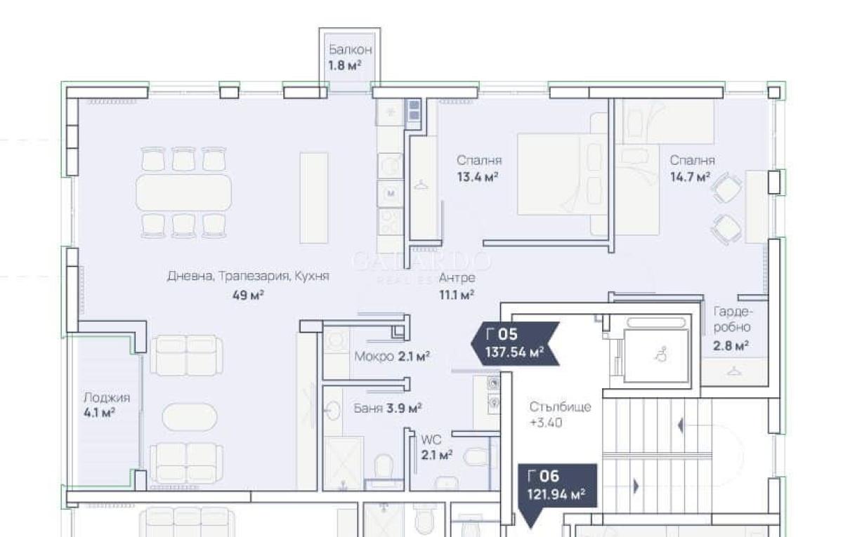 Към апартамента има бонус покривна тераса от 13 кв.м., която е извън посочената площ. Застроена площ 137.54кв.м. Изложение: запад /юг.