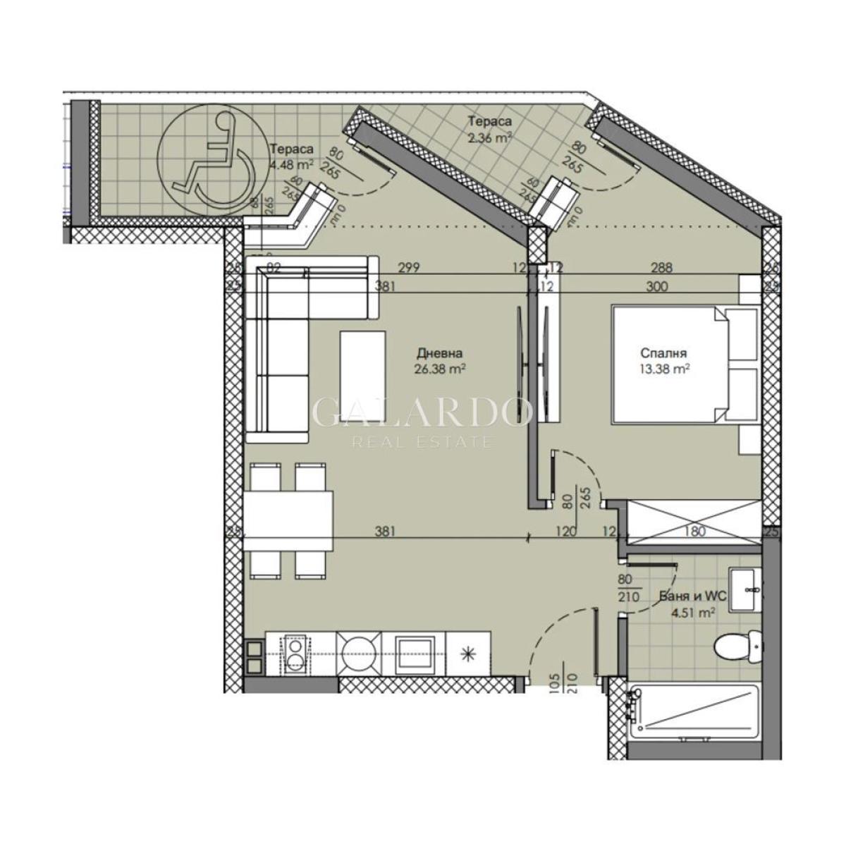 Жилището е разположено в нова сграда с модерен дизайн и естествено озеленяване. Състои се от дневна с кухненски бокс, спалня, баня с тоалетна и една тераса.