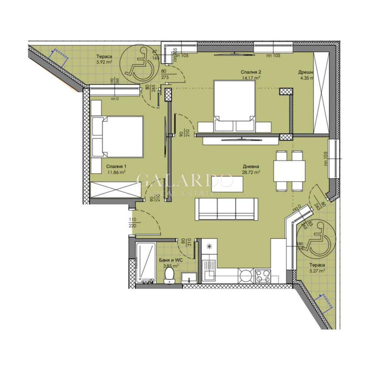 Жилището е разположено в нова сграда с модерен дизайн и естествено озеленяване. Състои се от дневна с кухненски бокс, две спалня, баня с тоалетна и две тераси.