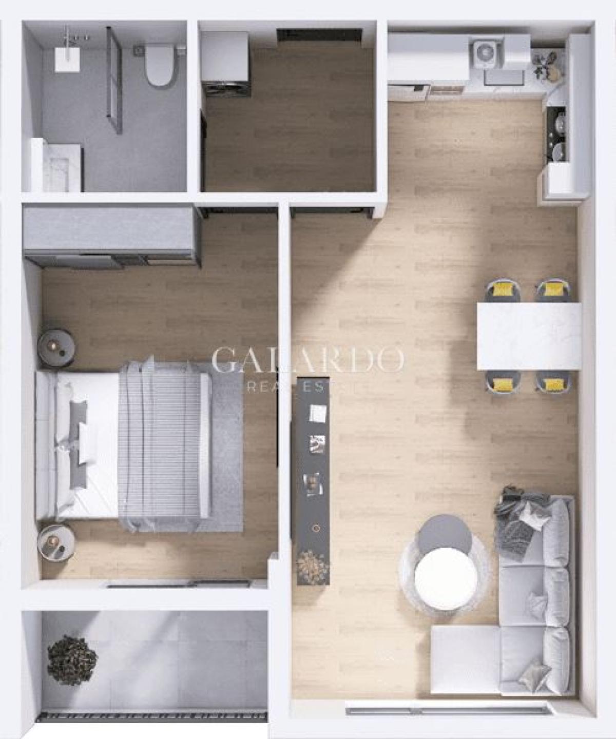 Жилището е разположено в сграда с модерен дизайн,  естествено озеленяване и собствен парк с детска площадка. Състои се от дневна с кухненски бокс, спалня, баня с тоалетна и една тераса.