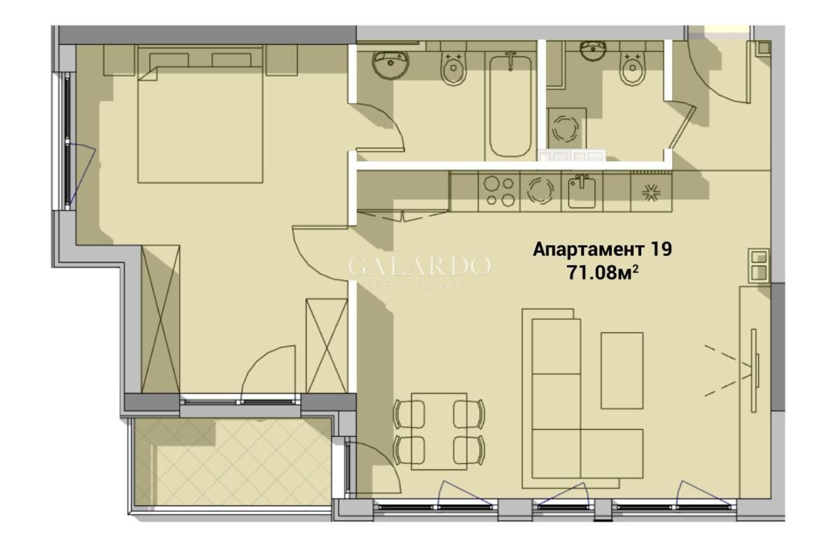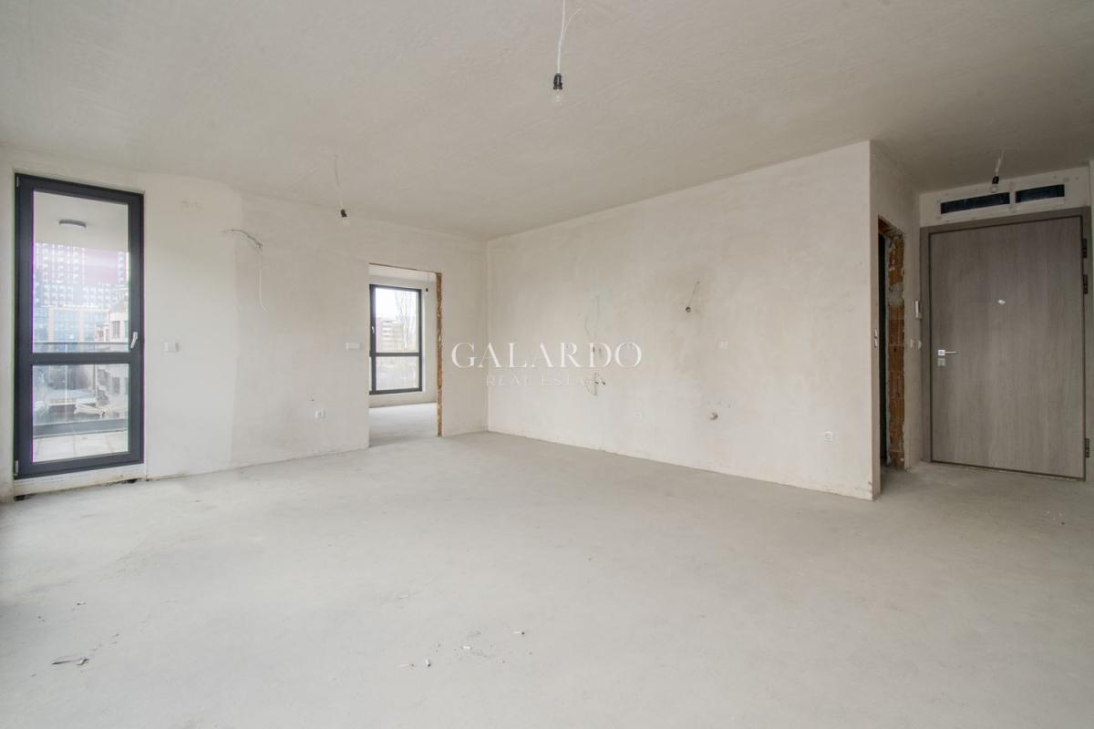Апартаментът е със застроена площ 71.08м2, на етаж 5-ти от 9. Площта е усвоена максимално, като има малко антре и от хола се преминава в спалнята. Отоплението е с ТЕЦ, има и изводи за климатици. Дограмата е 5-камерна Rehau. Изожение: изток/юг.