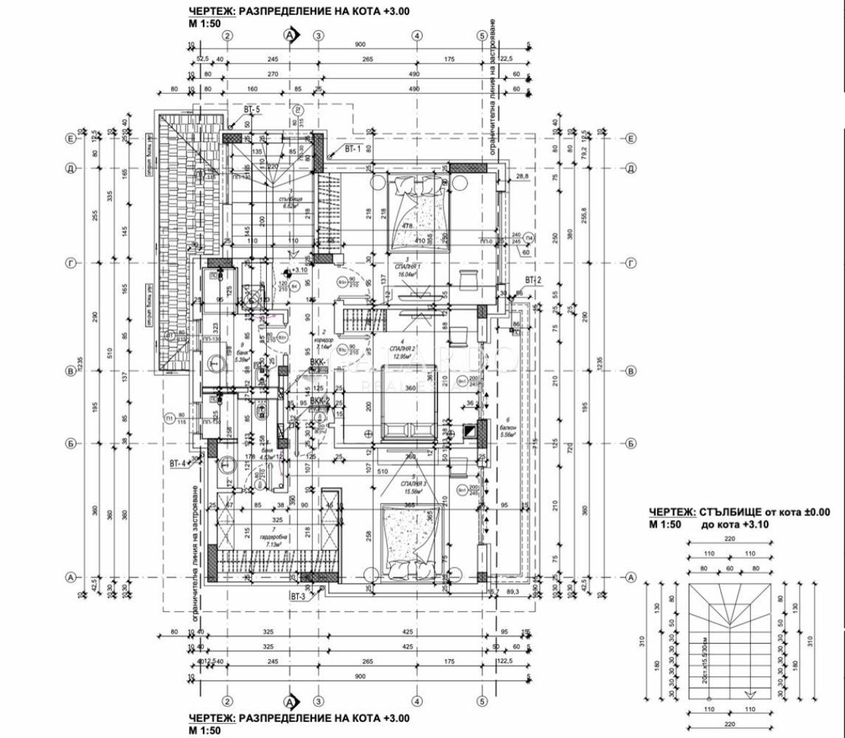Вторият етаж е с квадратура от 102.77 кв.м. и е с три спални, балкон, гардеробна, две бани с тоалетни.